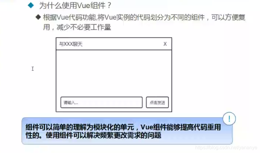 使用组件: 1.在Vue对象的管理的视图区域中,编写<组件名>标签即可.本质是将组件内容粘贴到此处. 2.可以使用N次组件.[类似于 声明1个方法,可以调用多次方法进行执行]。