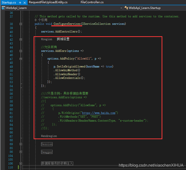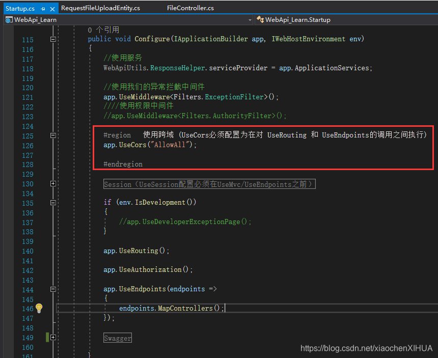 #region 使用跨域 (UseCors必须配置为在对 UseRouting 和 UseEndpoints的调用之间执行)