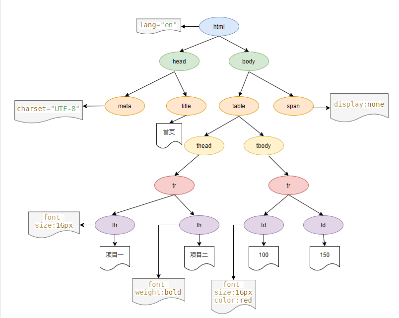 以上html代码经过HTML解析器解析后,会以html标签为根节点,按照从上到下、从外到内的顺序取出HTML标签,并按照从上到下,从左到右的顺序,依次生成如下DOM树:  生成DOM树后,CSS解析器会构建出样式表规则,并生成一个带有样式属性的DOM树。  根据DOM树和CSSOM树,最终会生成一棵Render Tree,最后生成的Render Tree最后会渲染到页面上。  最后渲染出来的Render Tree不包含不显示到界面上的head和display修饰的节点。