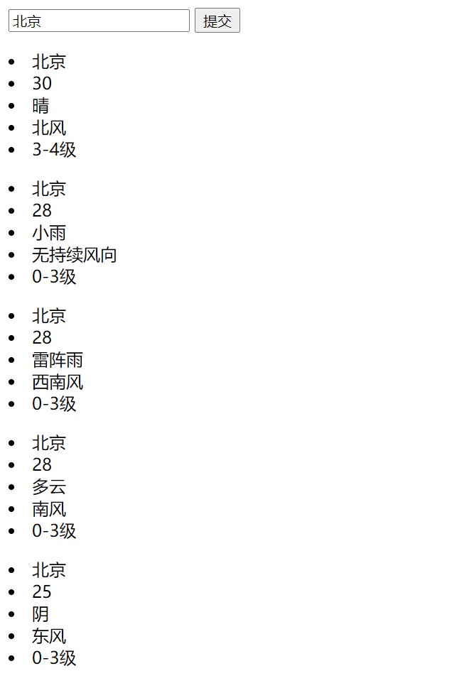 输出要求:每个天气要求:城市名,温度,天气,风向,风力