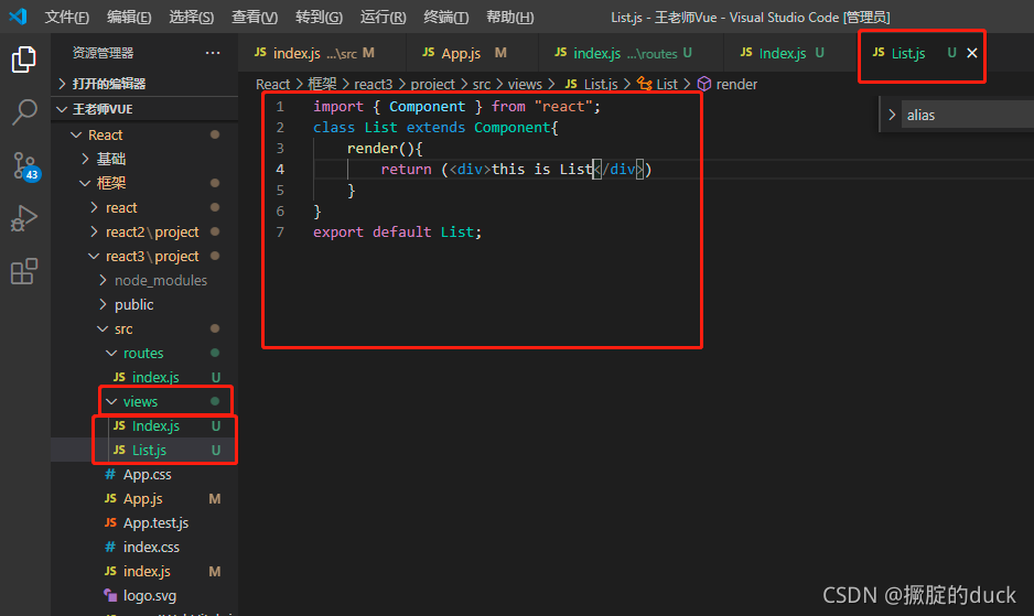替换成  然后新建view文件夹并且创建两个文件Index.js和List.js 在上面写上以下内容