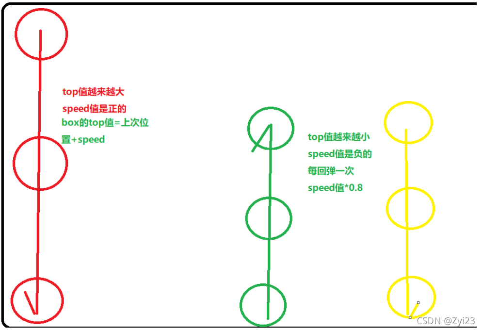 //获取节点 ?? ??? ?var obox = document.querySelector(".box"); ?? ??? ?var ocont = document.querySelector(".cont"); ?? ??? ? ?? ??? ?var speed = 10;?? ??? ?//设置步长 ?? ??? ?var target = ocont.offsetHeight - obox.offsetHeight;?? ?//设置目标 ?? ??? ?var g = 2;?? ??? ??? ?//设置重力 ?? ??? ?var timer;? ? ? ? ? ?//设置计时器 ?? ??? ? ?? ??? ?document.onclick = function(){ //?? ??? ??? ?点击之前先清除,上一次 ?? ??? ??? ?clearInterval(timer) ?? ??? ??? ?timer = setInterval(()=>{ //?? ??? ??? ??? ?重力加速 ?? ??? ??? ??? ?speed += g; //?? ??? ??? ??? ?判断是否到重点 ?? ??? ??? ??? ?if(speed >= target-obox.offsetTop){ //?? ??? ??? ??? ??? ?强行确认到终点 ?? ??? ??? ??? ??? ?obox.style.top = target + "px"; //?? ??? ??? ??? ??? ?回弹,回弹损耗 ?? ??? ??? ??? ??? ?speed = -parseInt(speed*0.8); //?? ??? ??? ??? ??? ?console.log(speed) //?? ??? ??? ??? ??? ?当回弹不足1的时候,意味着不再弹起了,就可以清除计时器了 ?? ??? ??? ??? ??? ?if(Math.abs(speed) < 1){ ?? ??? ??? ??? ??? ??? ?clearInterval(timer) ?? ??? ??? ??? ??? ?} ?? ??? ??? ??? ?}else{ //?? ??? ??? ??? ??? ?生效位置 ?? ??? ??? ??? ??? ?obox.style.top = obox.offsetTop + speed + "px"; ?? ??? ??? ??? ?} ?? ??? ??? ?},30)?? ??? ?//频率 ?? ??? ?} ?? ??? ? ?? ??? ? ?? ?</script>