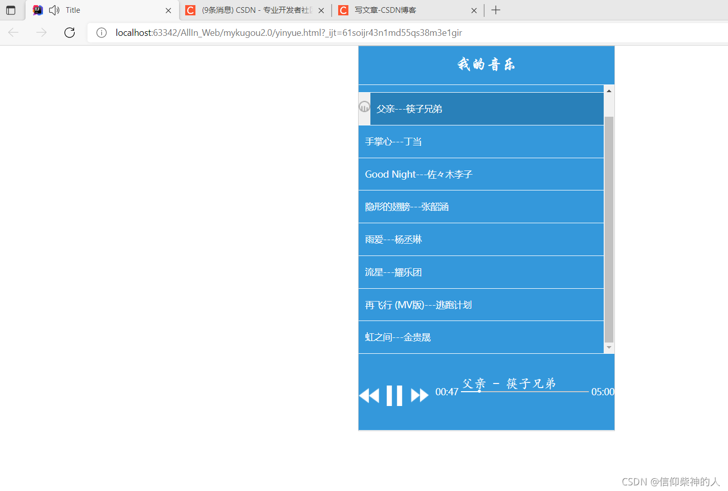 网页结构布局:我的歌曲不是直接写上去的,是加载json对象的。所以这里我写的内容部分的歌曲只是一个格式。上一首/播放、暂停/下一首的图标,我是用a标签写的,图标加在a标签背景上。歌曲播放的进度这块我是用两个div实现的,里面的一个div显示灰色当作总进度,上面的一个div显示白色当作当前歌曲播放进度。