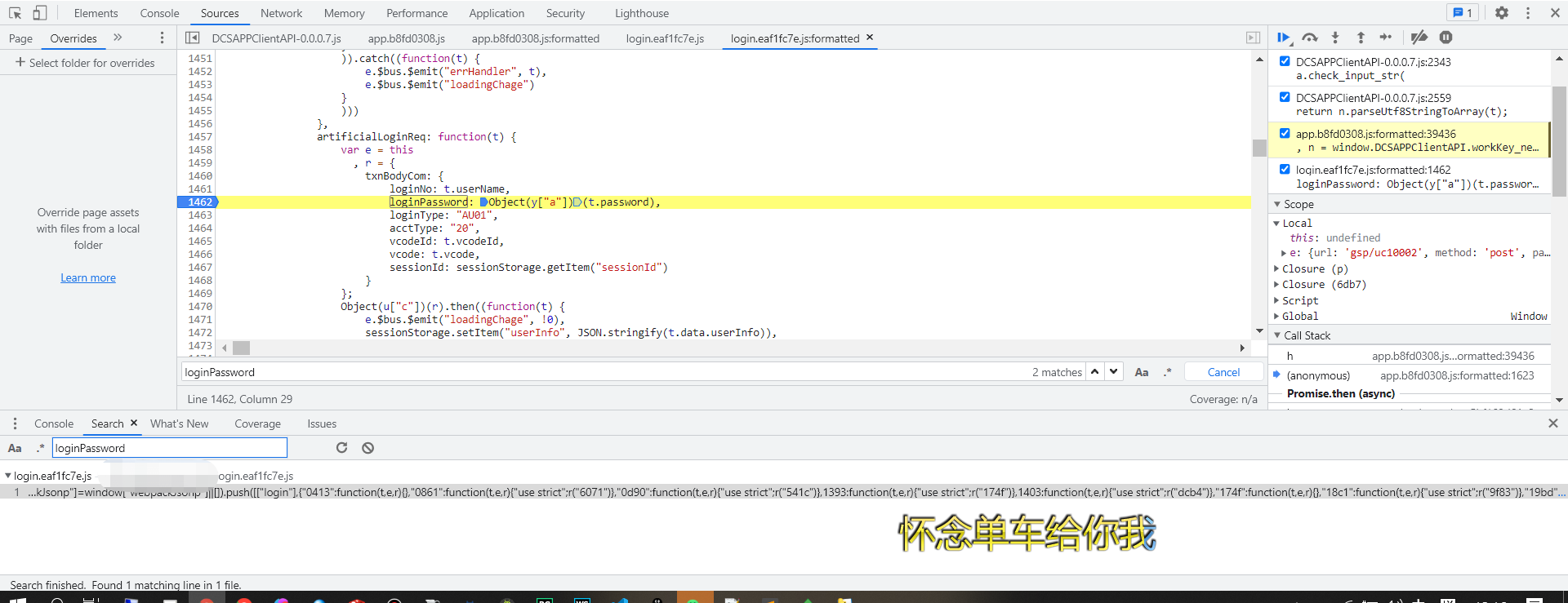 这里的处理逻辑:传入一个对象,转化成字符串,通过window.DCSAPPClientAPI.parseUtf8StringToArray处理得到最终的t值(数组)。 这里可以发现t的处理函数和n的处理函数在同一文件的window.DCSAPPClientAPI中,so,进去拿出来就好,这里县不急去扣js。因为e.data中可以看到loginPassword值是加密值,经过多次刷新断点,只有loginPassword会变化,所以先搞loginPassword的生成逻辑。