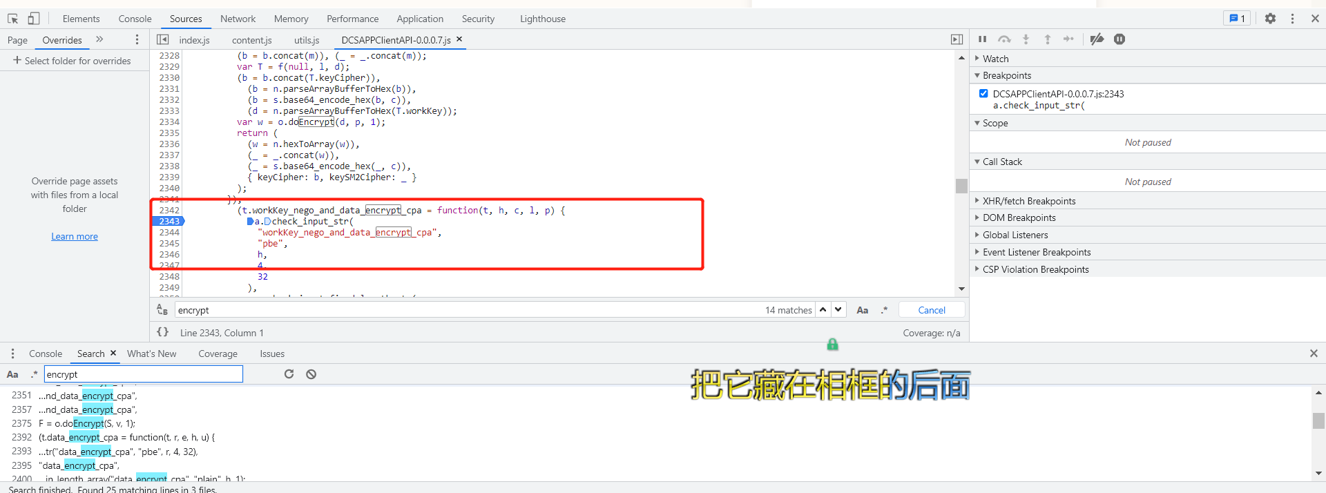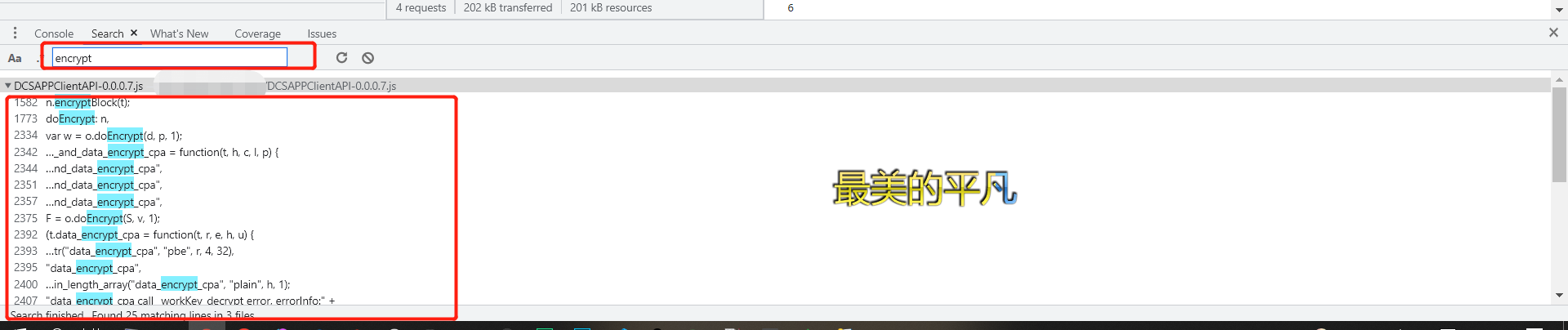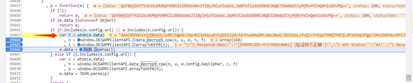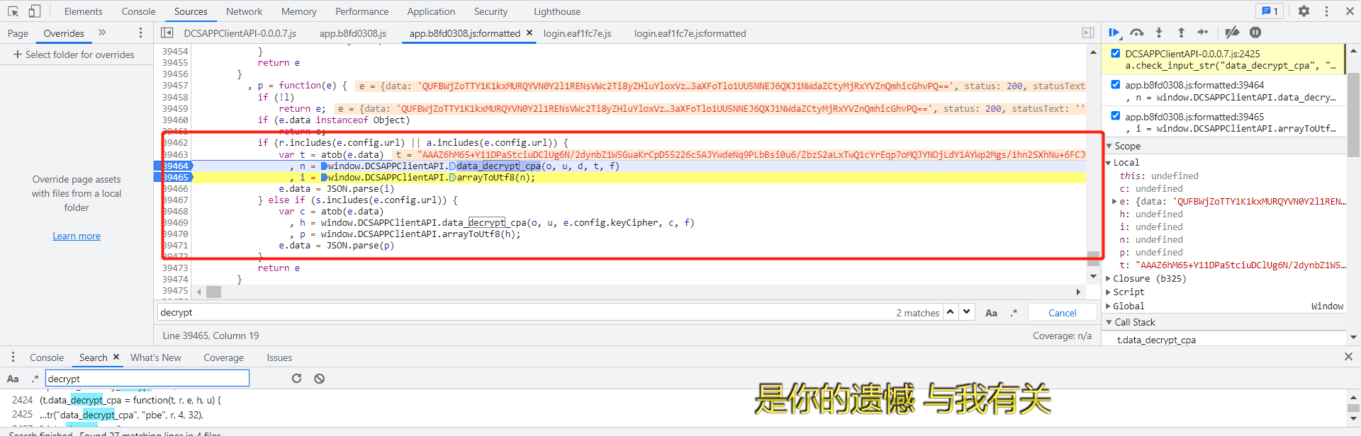 这里使用解密关键字“decrypt”搜索:  打断点,追到上一个堆栈:  打印输出结果:  可以发现这里也是使用了window.DCSAPPClientAPI中的函数进行解密处理,所以接下来找到传入的参数就OK了。