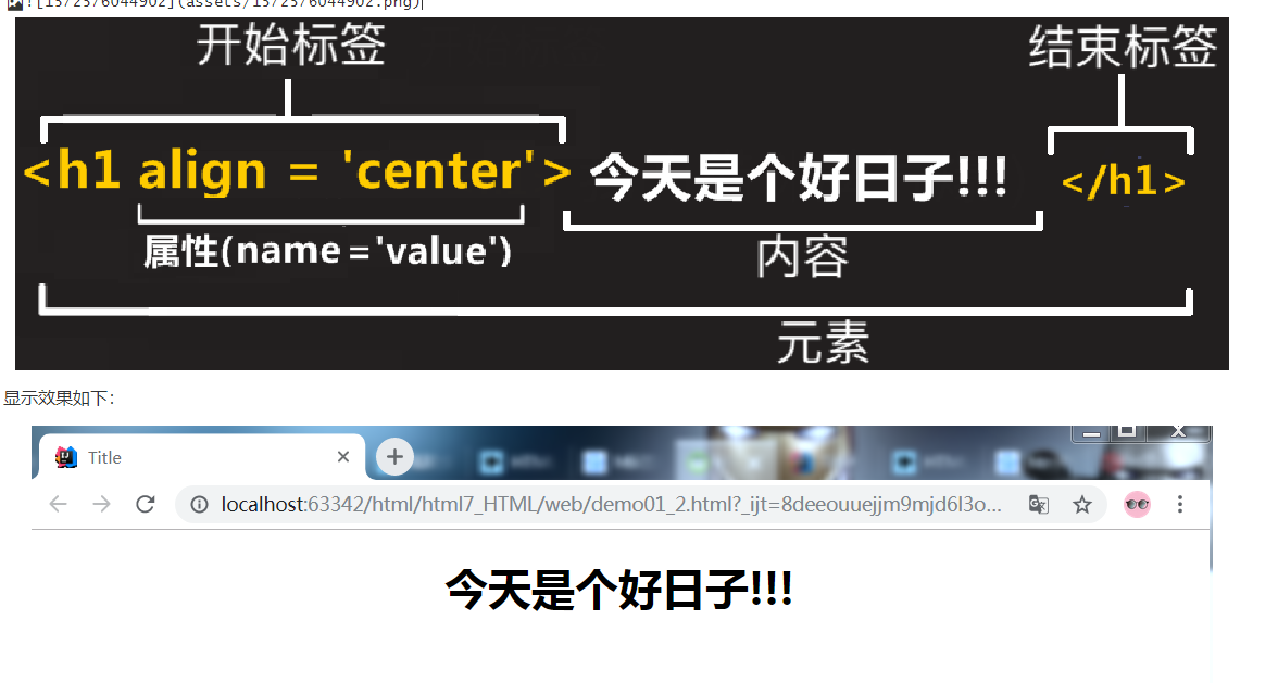 元素(Element):开始标签、结束标签与内容相结合,便是一个完整的元素。 -