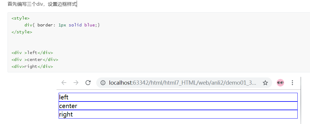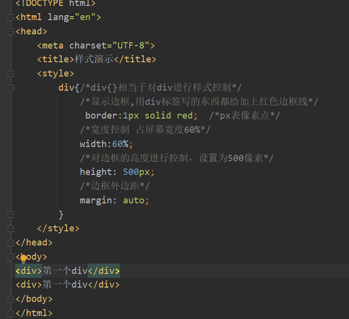 ?演示基本的布局方式【样式的控制】,在head标签里面通过style标签进行样式的控制,div{}代表的是我们要给body中的div标签进行一些样式的控制