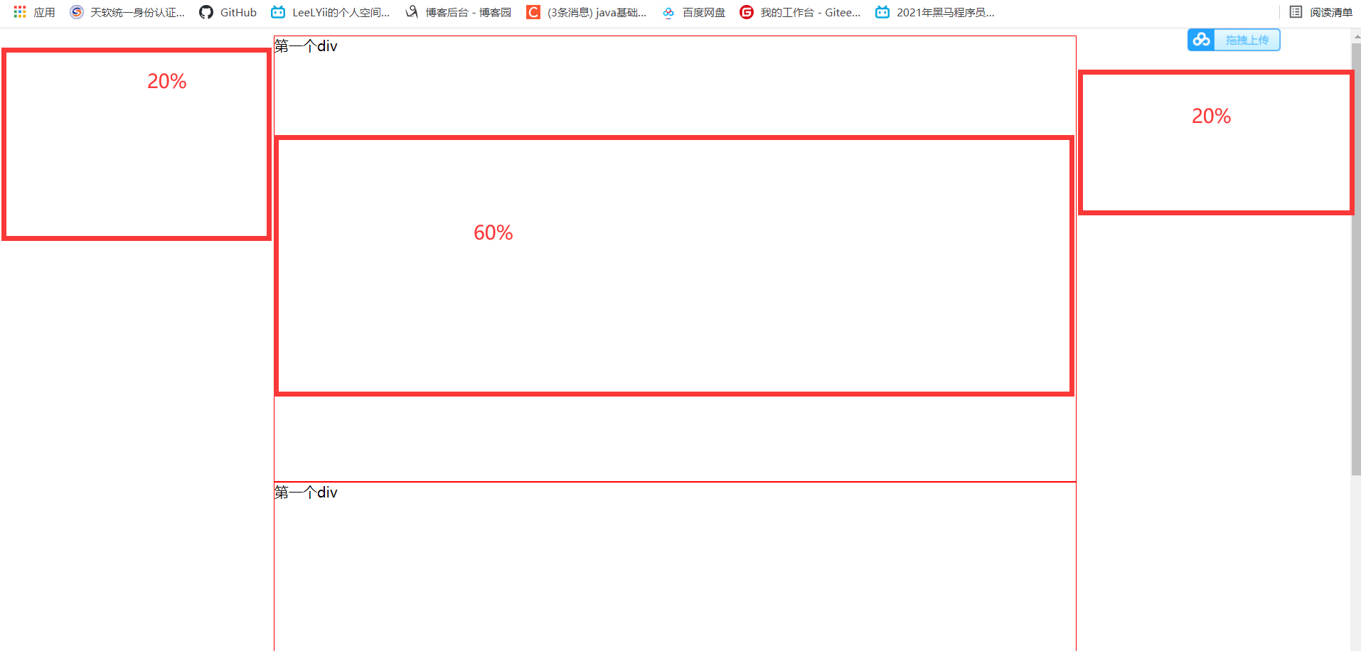 中间三个部分也可以通过三个div显示,原本div是独占一行的,通过浮动效果,让三个div在中间的不同位置显示