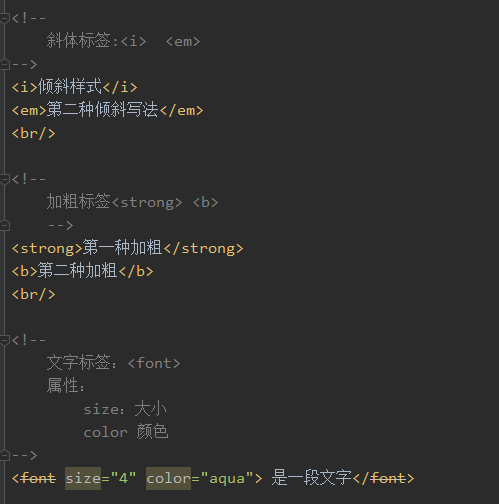 p | 表示文本的一个段落 | h | 表示文档标题,<h1>–<h6> ,呈现了六个不同的级别的标题,<h1> 级别最高,而 <h6> 级别最低 | hr | 表示段落级元素之间的主题转换,一般显示为水平线 【属性:size color】 | li | 表示列表里的条目。????????【无序,有序列表内每条数据编写的位置】 | ul | 表示一个无序列表,可含多个元素,无编号(都是图标:?,■···)显示。? 【属性:type】【列表项li】 | ol | 表示一个有序列表,通常渲染为有带编号(1,2,3,A,B,C···)的列表,【属性:type start】【列表项li】 | em | 表示文本着重,一般用斜体显示 | strong | 表示文本重要,一般用粗体显示 | font | 表示字体,可以设置样式(已过时)????????????????【属性:size color】 | i | 表示斜体 | b | 表示加粗文本 |