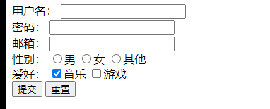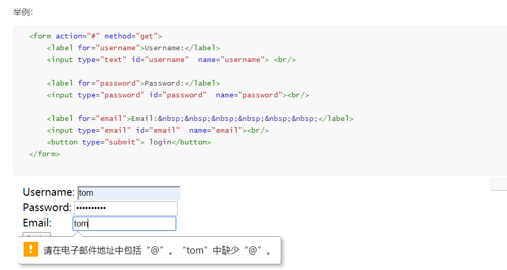 text | 普通文本框单行普通文本字段 | | password | 单行文本字段,值被遮盖。密码框 | | email | 邮箱框,简单验证。用于编辑 e-mail 的字段,可以对e-mail地址进行简单校验,有@才会提交成功 |