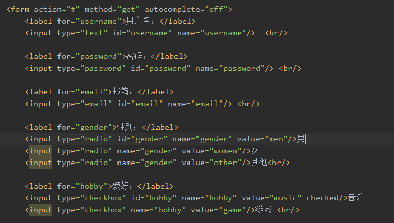 label | 表单元素的说明,配合表单项使用 | for属性,属性值必须和表单项标签的id属性值一致 | input | 表单项标签。表单中输入控件,多种输入类型,用于接收来自用户数据 | type属性值决定输入类型 | button | 页面中可点击的按钮,可以配合表单进行提交 | type属性值决定按钮类型(submit,reset,button) |
