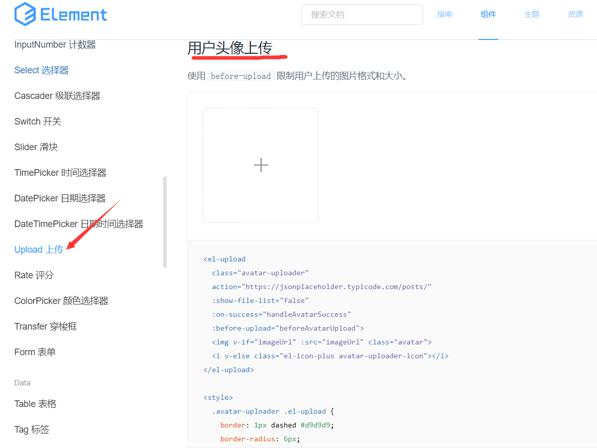 注意:打开element-ui官网找到Upload上传,点开用户头像上传,拿到想要的效果  4.路由:index.js