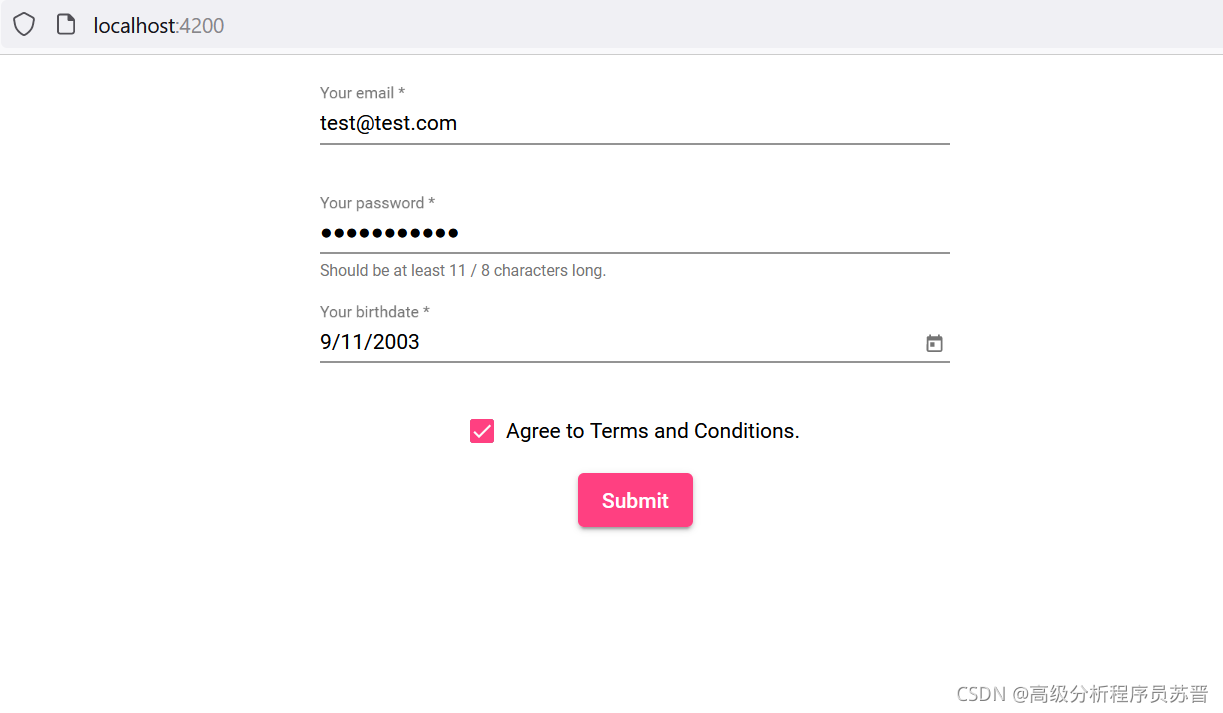 <mat-checkbox ngModel name="agree" required>Agree to Terms and Conditions.</mat-checkbox>