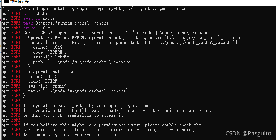 npm ERR! code EPERM npm ERR! syscall mkdir npm ERR! path D:\node.js\node_cache\_cacache npm ERR! errno -4048 npm ERR! Error: EPERM: operation not permitted, mkdir 'D:\node.js\node_cache\_cacache' npm ERR! ?[OperationalError: EPERM: operation not permitted, mkdir 'D:\node.js\node_cache\_cacache'] { npm ERR! ? cause: [Error: EPERM: operation not permitted, mkdir 'D:\node.js\node_cache\_cacache'] { npm ERR! ? ? errno: -4048, npm ERR! ? ? code: 'EPERM', npm ERR! ? ? syscall: 'mkdir', npm ERR! ? ? path: 'D:\\node.js\\node_cache\\_cacache' npm ERR! ? }, npm ERR! ? isOperational: true, npm ERR! ? errno: -4048, npm ERR! ? code: 'EPERM', npm ERR! ? syscall: 'mkdir', npm ERR! ? path: 'D:\\node.js\\node_cache\\_cacache' npm ERR! } npm ERR! npm ERR! The operation was rejected by your operating system. npm ERR! It's possible that the file was already in use (by a text editor or antivirus), npm ERR! or that you lack permissions to access it. npm ERR! npm ERR! If you believe this might be a permissions issue, please double-check the npm ERR! permissions of the file and its containing directories, or try running npm ERR! the command again as root/Administrator.
