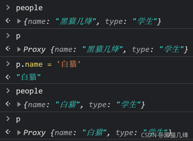 在控制台中测试后发现,通过改变p对象中元素的数据后,people中的数据也会得到改变。