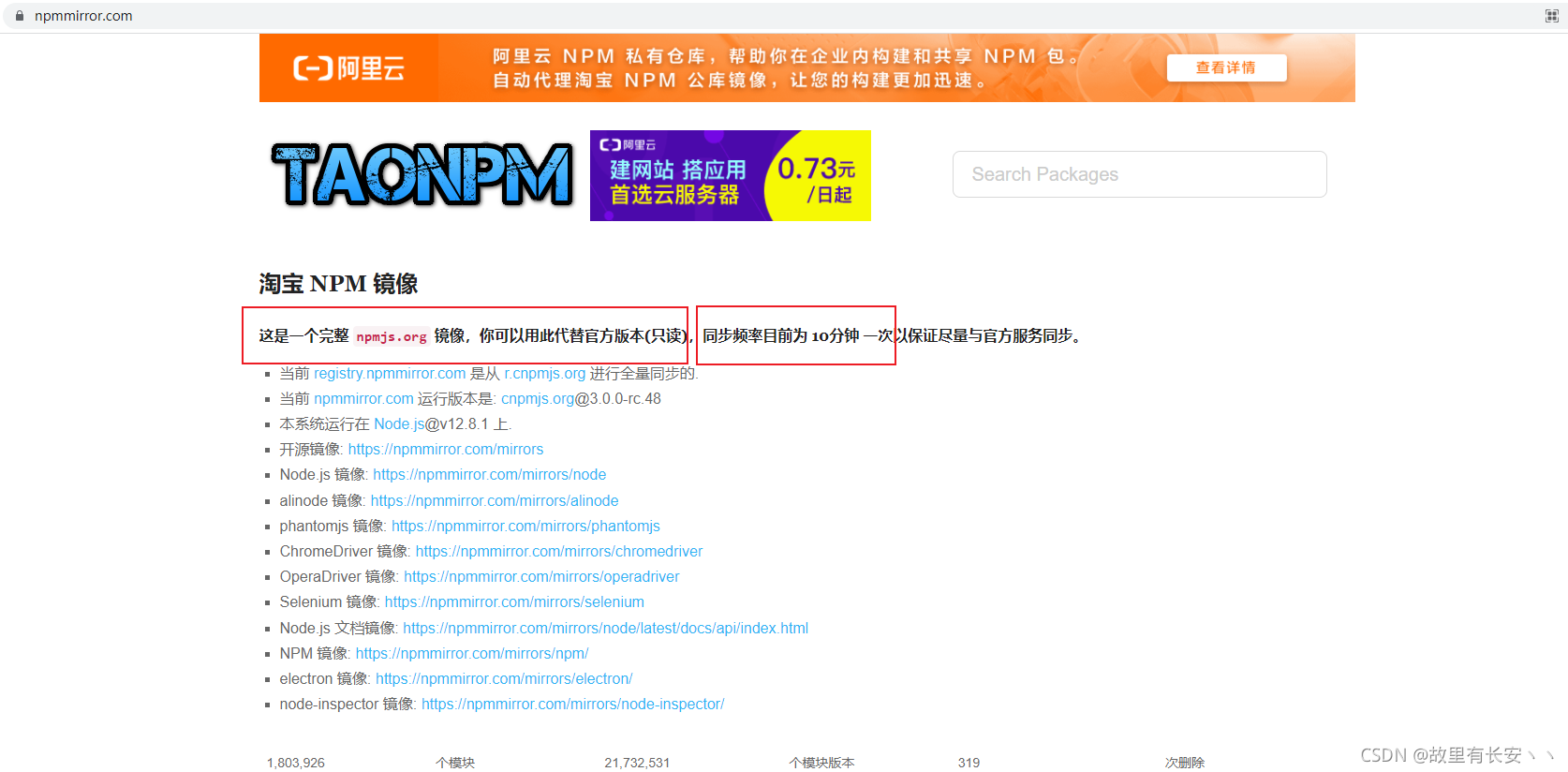 我们来简单解释解释一下这句话的含义:什么是“镜像”,简单来讲就是“备份”的意思,用该网站上的第三方包也同样可以发挥出官网的包原有的作用;“同步频率”是说每隔10分钟,淘宝npm就会根据npm官网来更新一次,保障与官网同步。