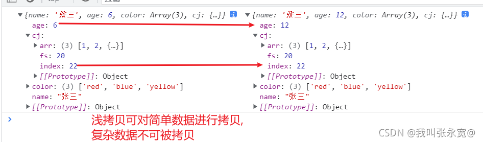 - 拷贝对于简单类型,可以拿到值. 而对于复杂数据类型来说,只能拿到内存地址