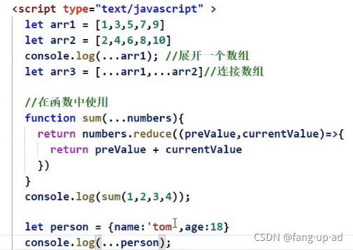 - 展开运算符可以展开数组 ,可以作为函数的形参,然后函数内将参数作为数组处理