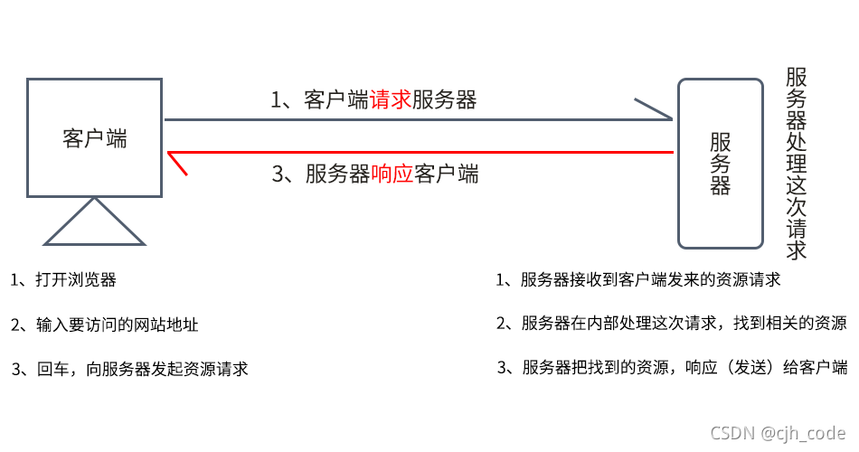 - 客户端与服务器之间的通信过程,分为请求-处理-响应三个步骤