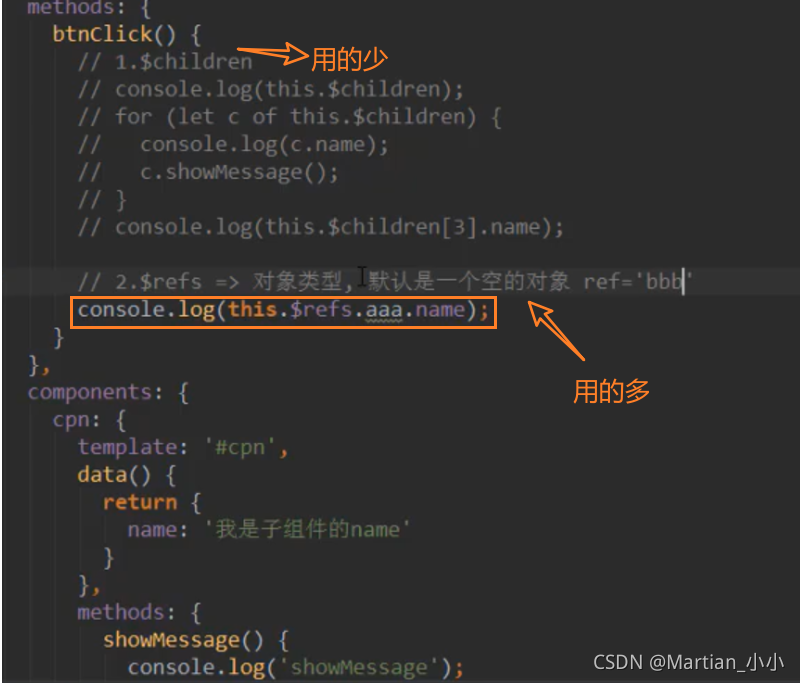 <child-cpn :message="message"></child-cpn> 通过:message="message"将data中的数据传给了props(双引号中的message才是绑定的数据变量)- 将props中的数据显示在子组件中