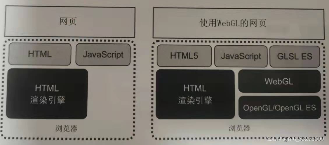 ????????webgl包含了三种语言。HTML5(超文本标记语言)、JavaScript和GLSL ES。下图展示了传统网页(左侧)和webgl网页(右侧)的软件结构。
