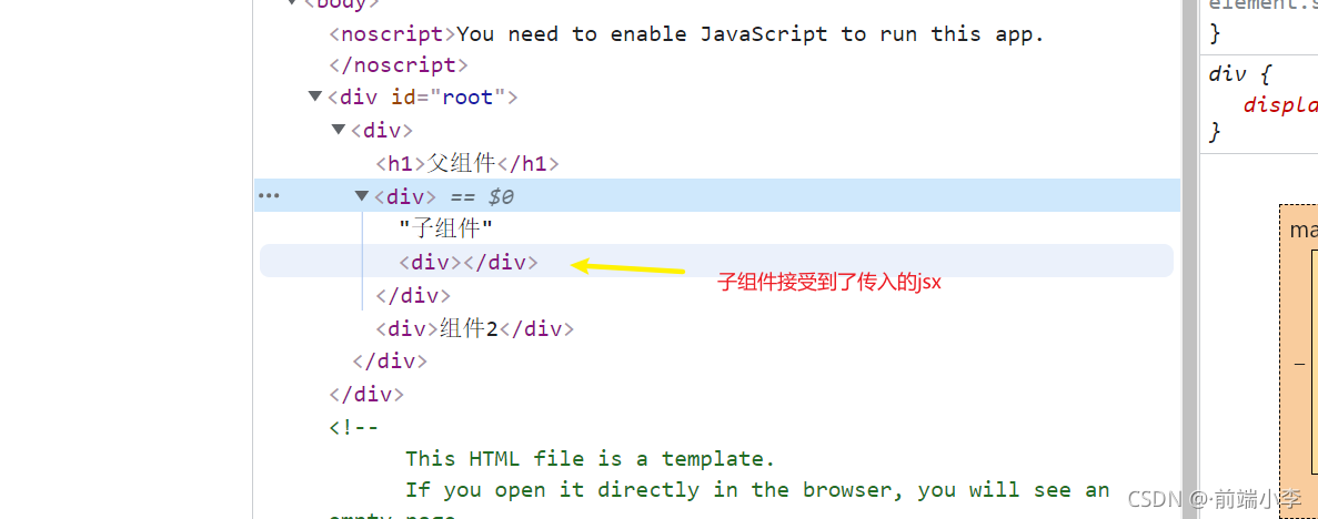 在组件中间进行包裹会自动传入到props中的children属性中 在子组件中通过this.props.children可以进行访问 如下图我传入了jsx
