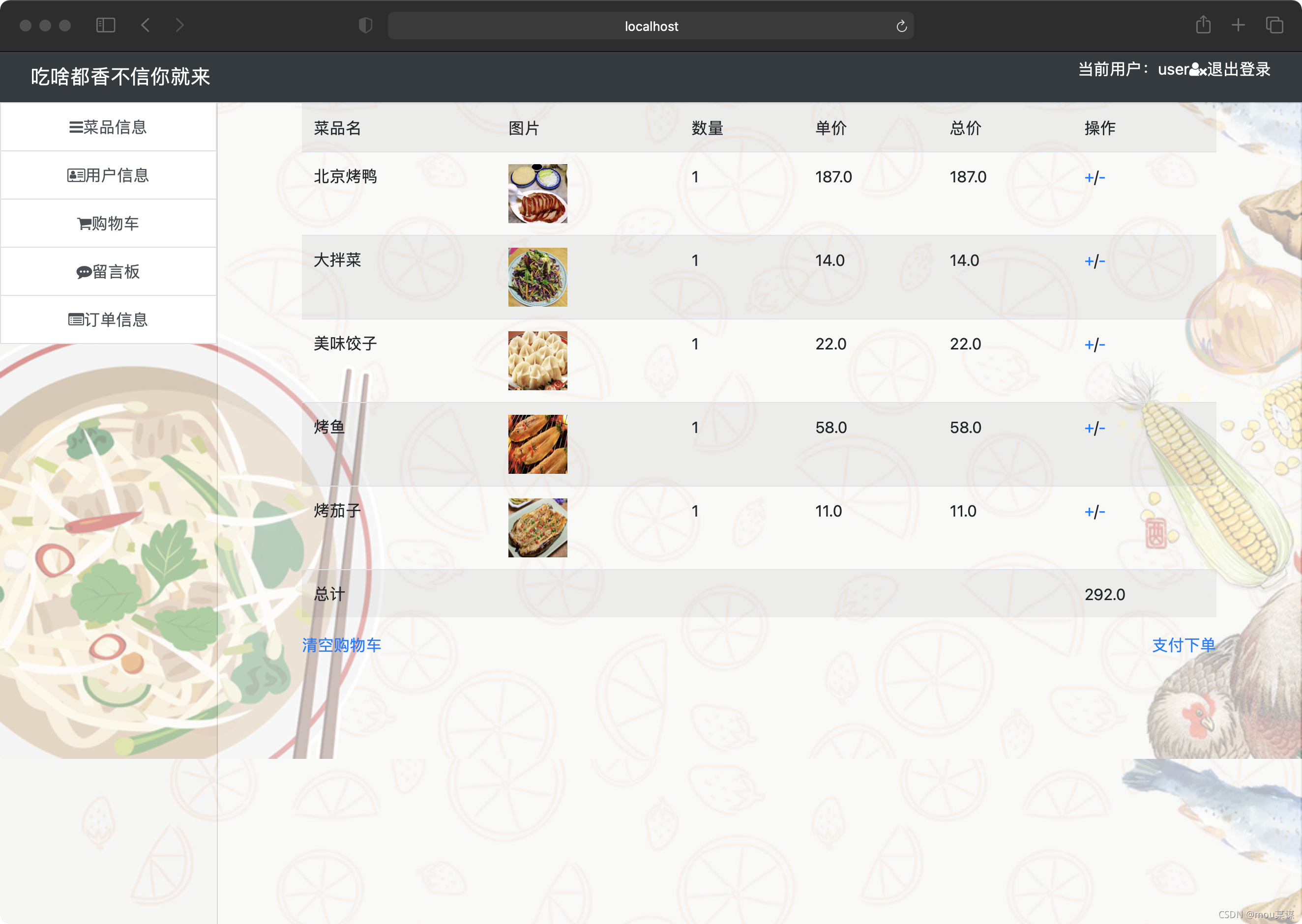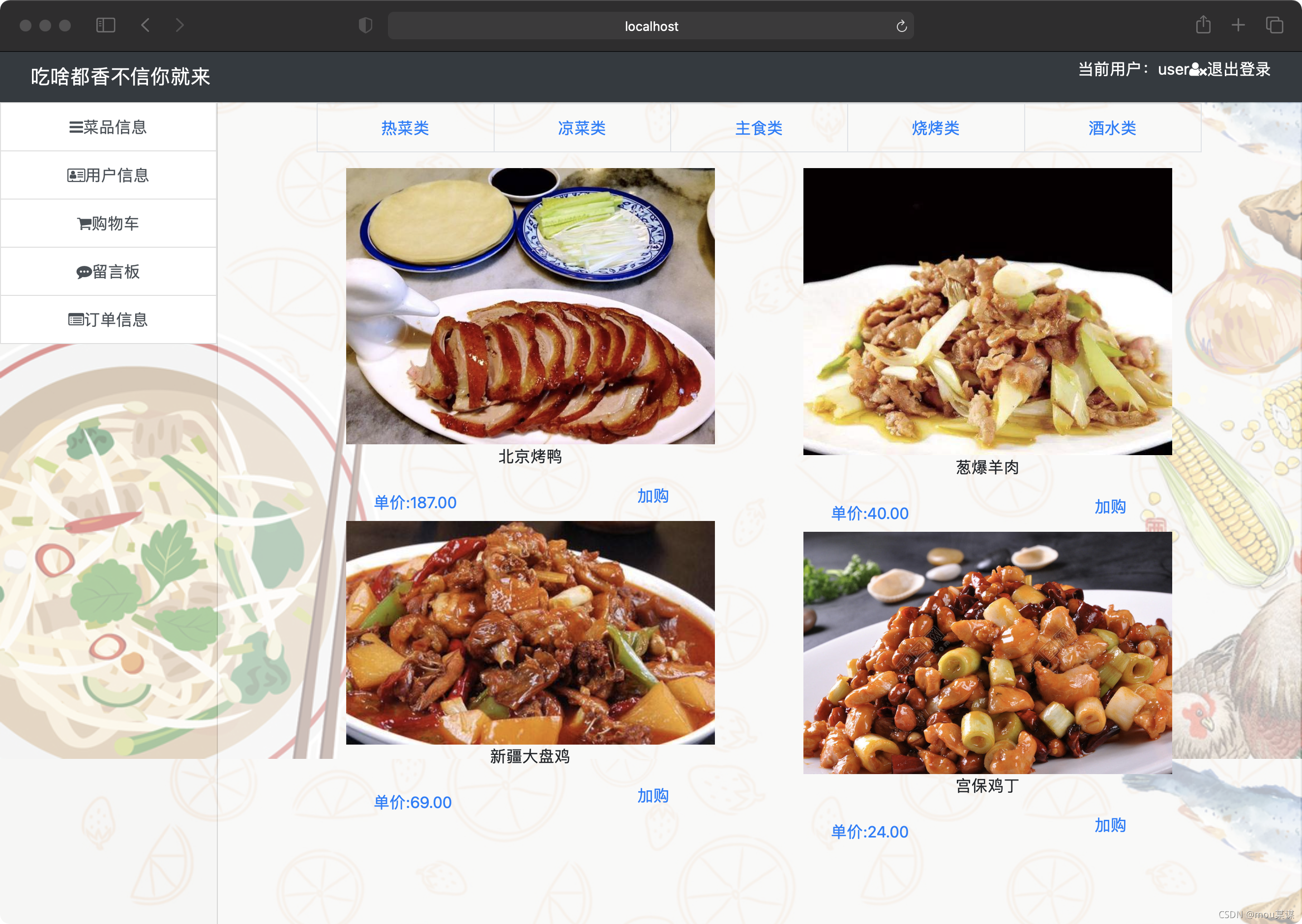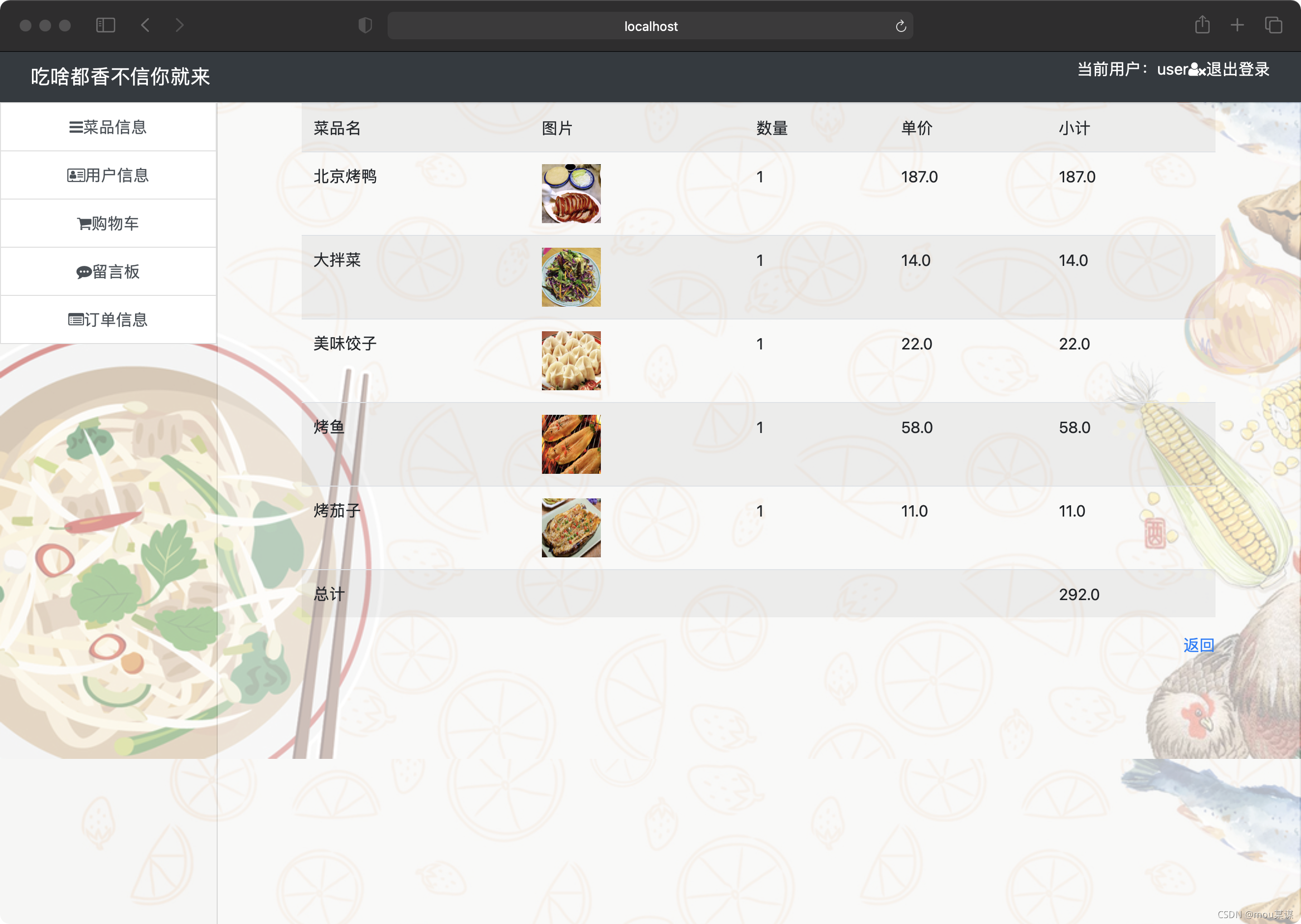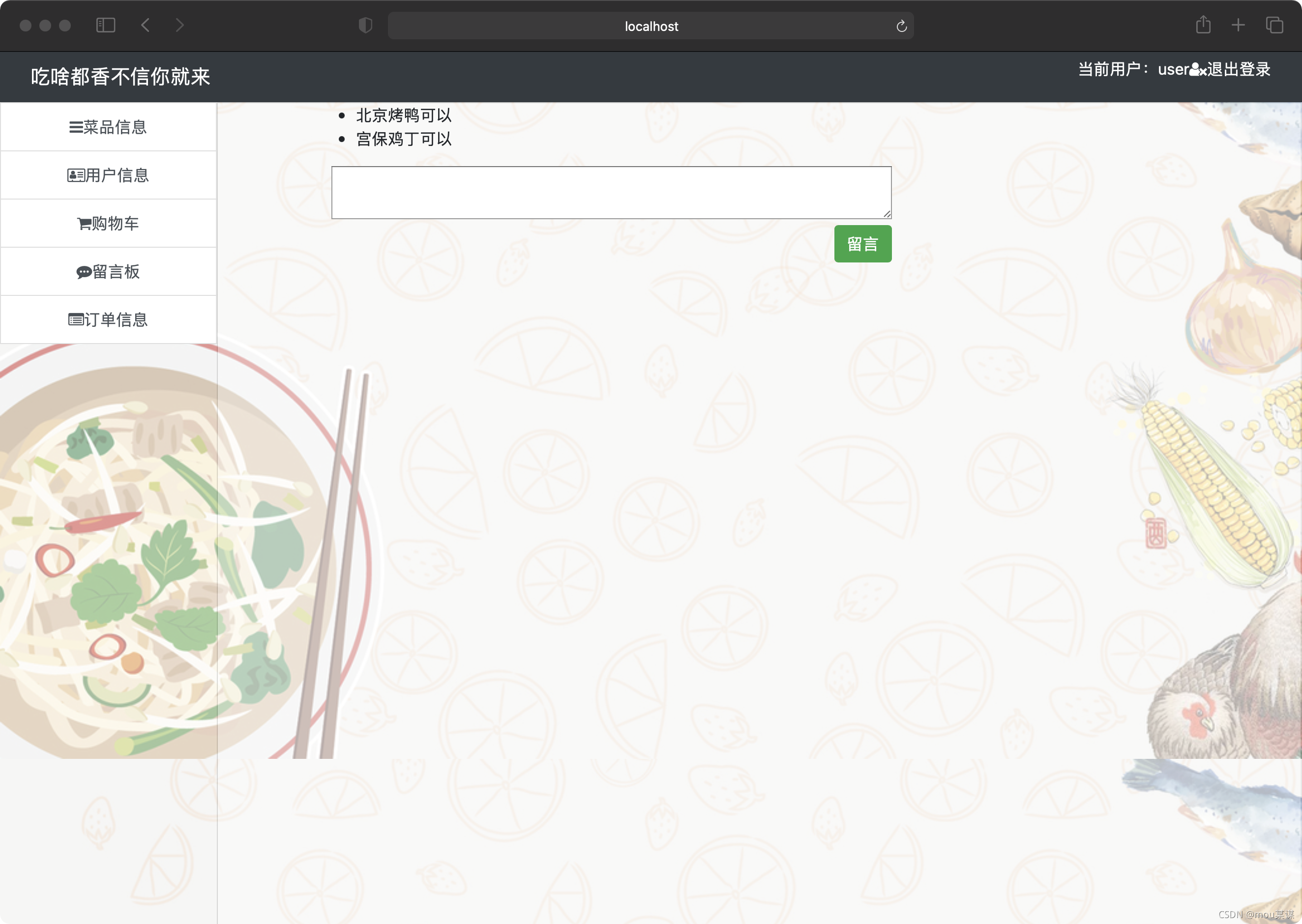 基于用户的登录注册,浏览菜品,添加修改购物车,查看以下单的订单信息,留言评论并查看所有人评论,查看并修改个人信息及密码等