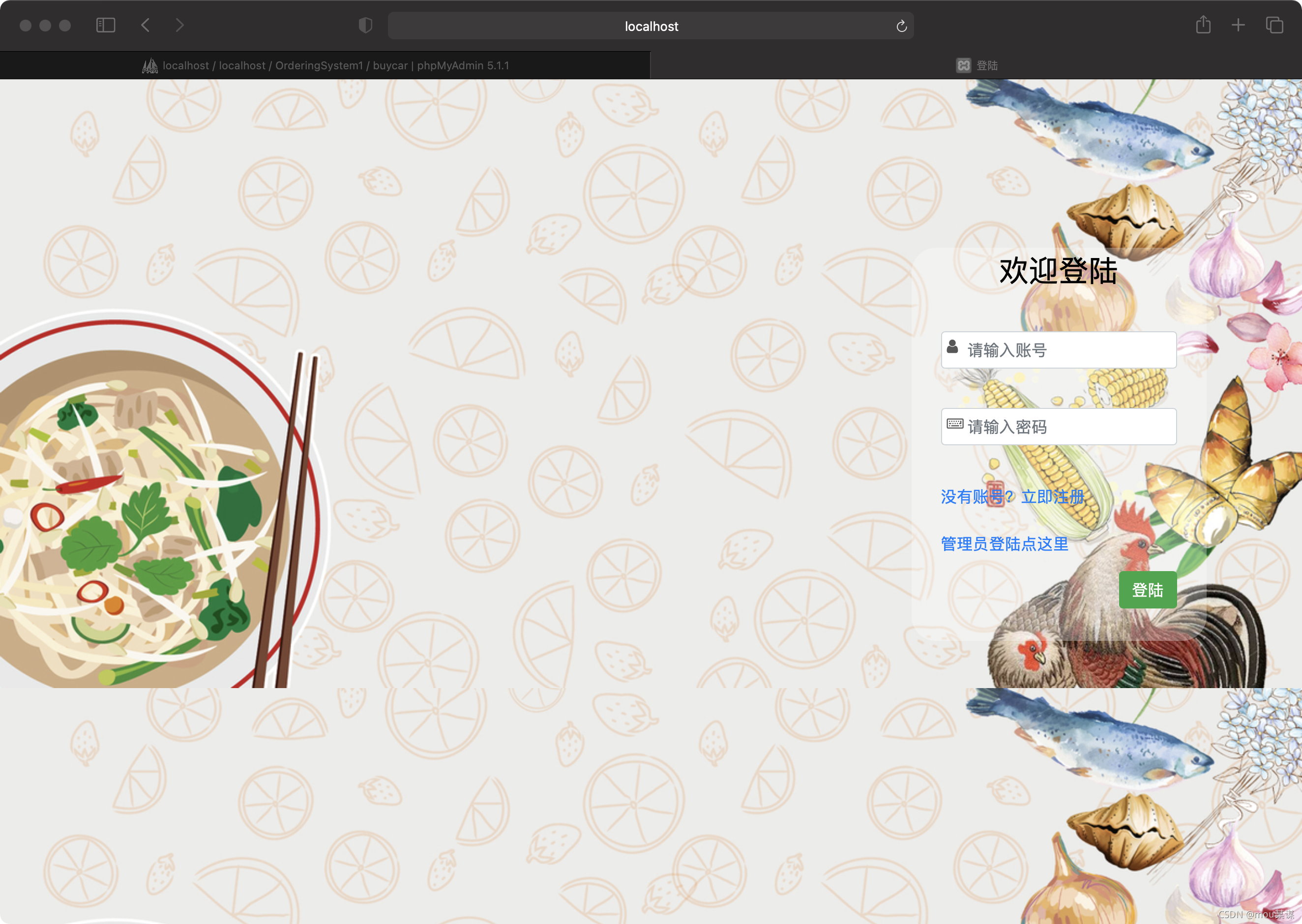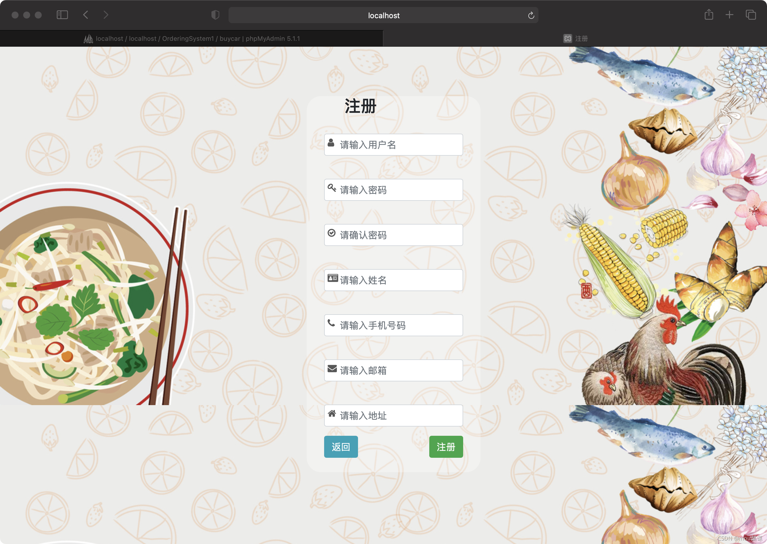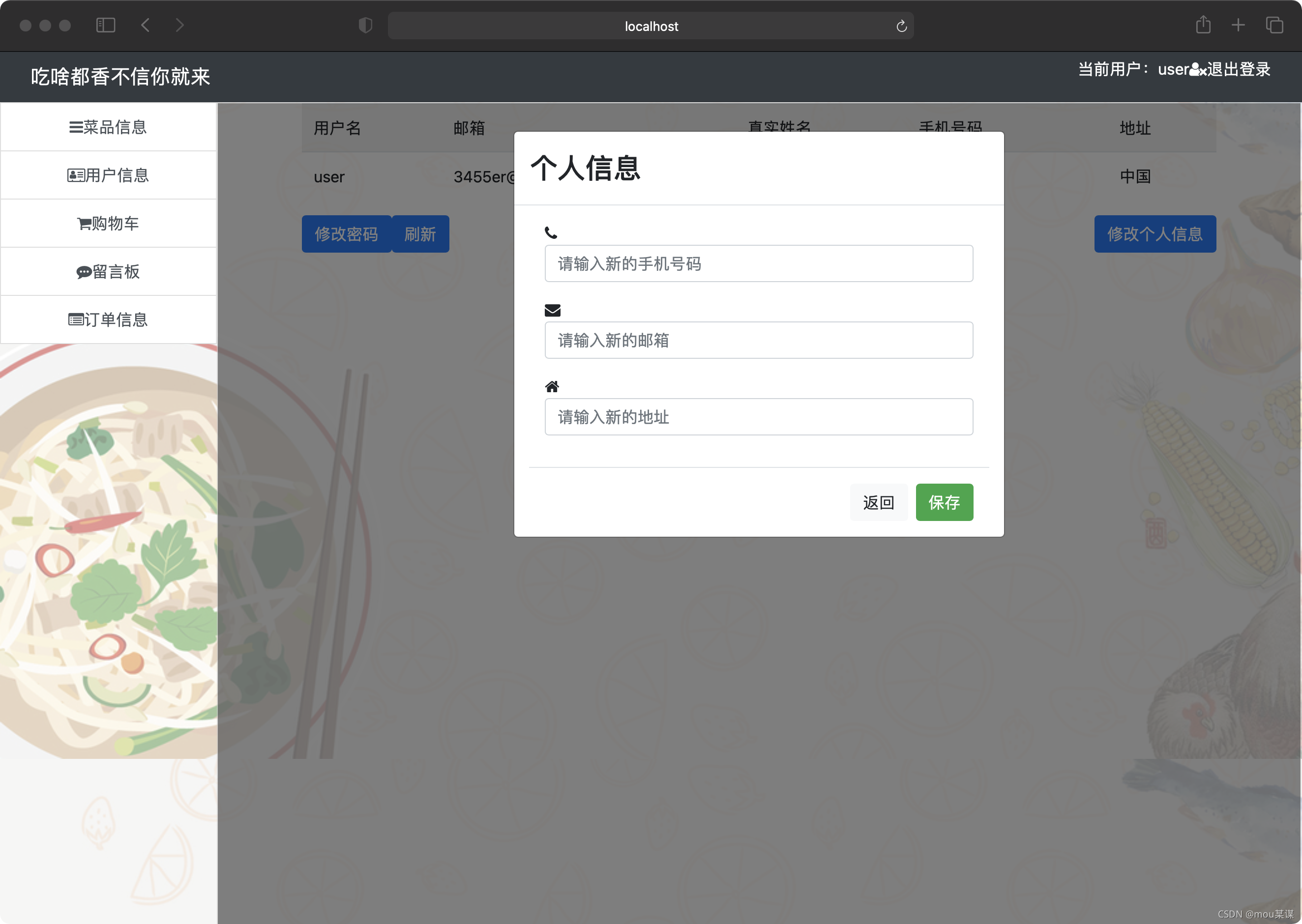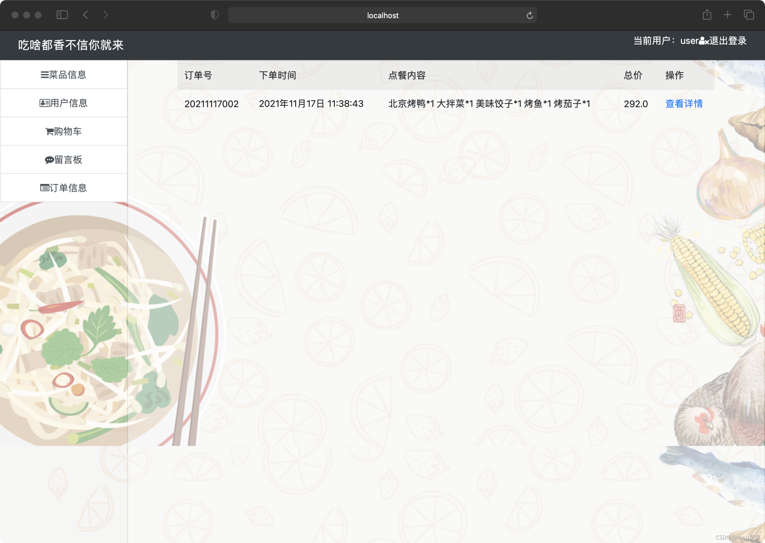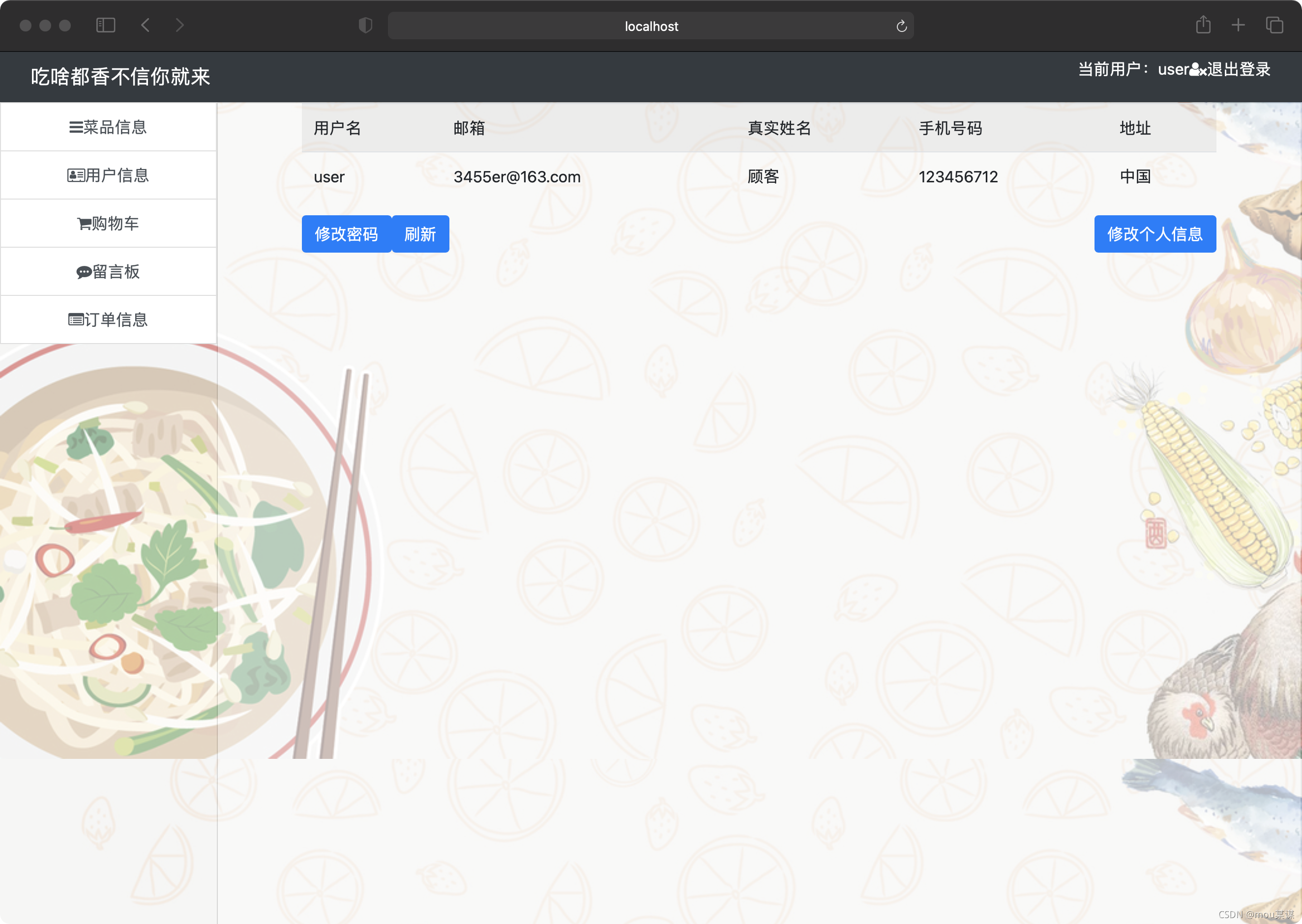 基于用户的登录注册,浏览菜品,添加修改购物车,查看以下单的订单信息,留言评论并查看所有人评论,查看并修改个人信息及密码等