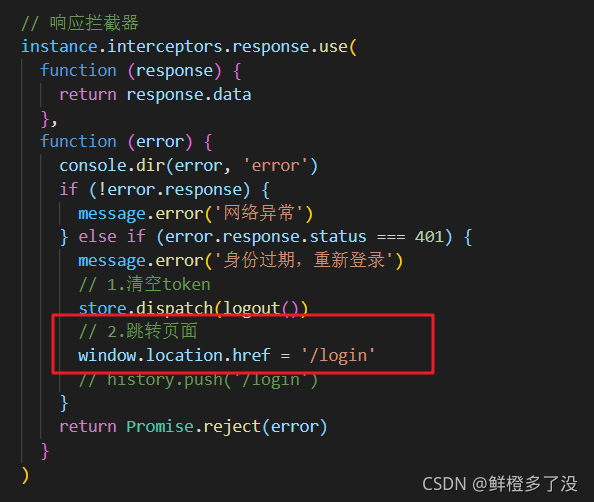 3.最后在拦截器中导入自定义的history直接获取动态路由(history.push('/login'))