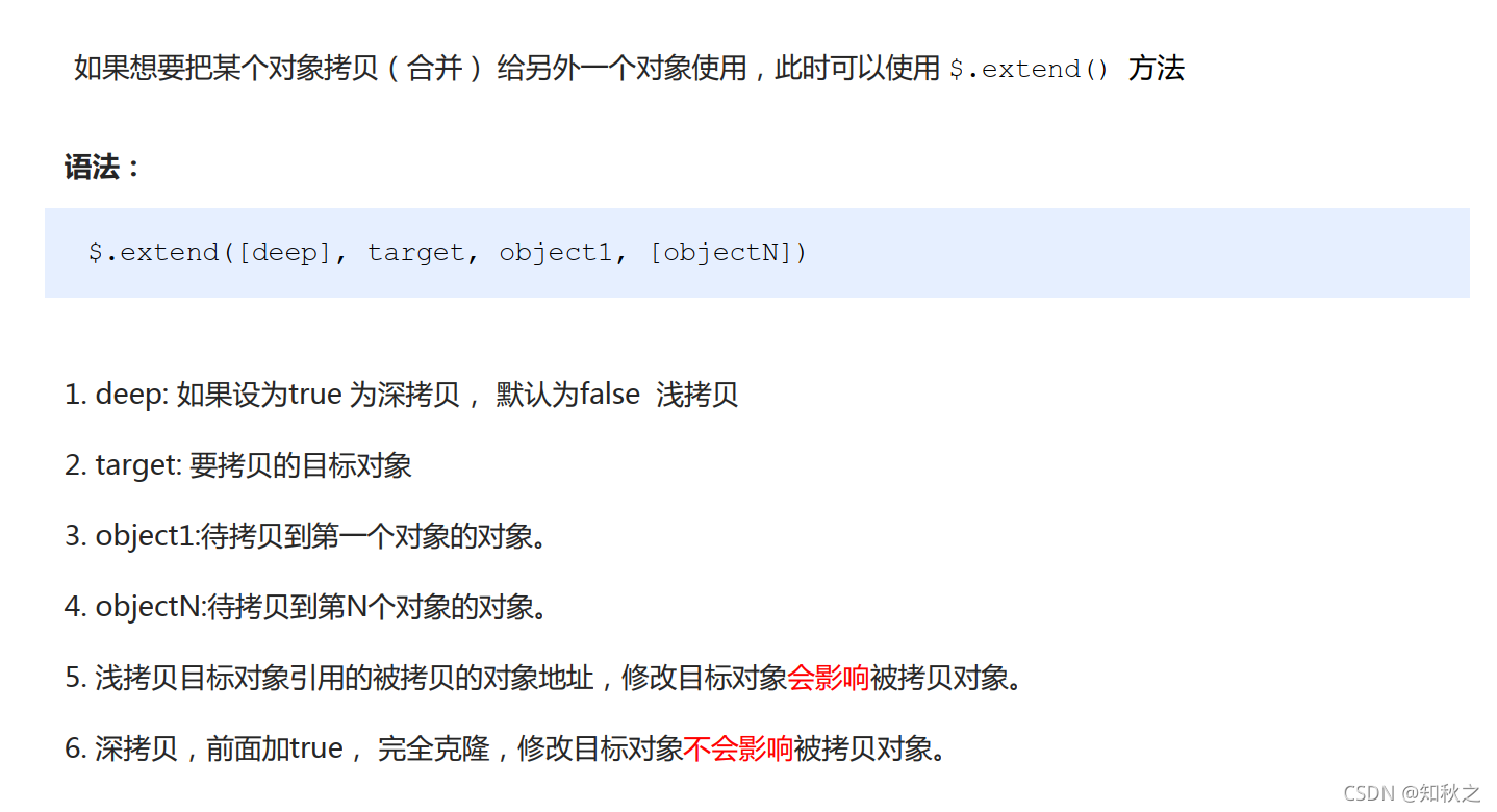 $.extend(targetObj, obj); //拷贝语法,把obj内的属性和属性值拷贝给targetObj一个空对象