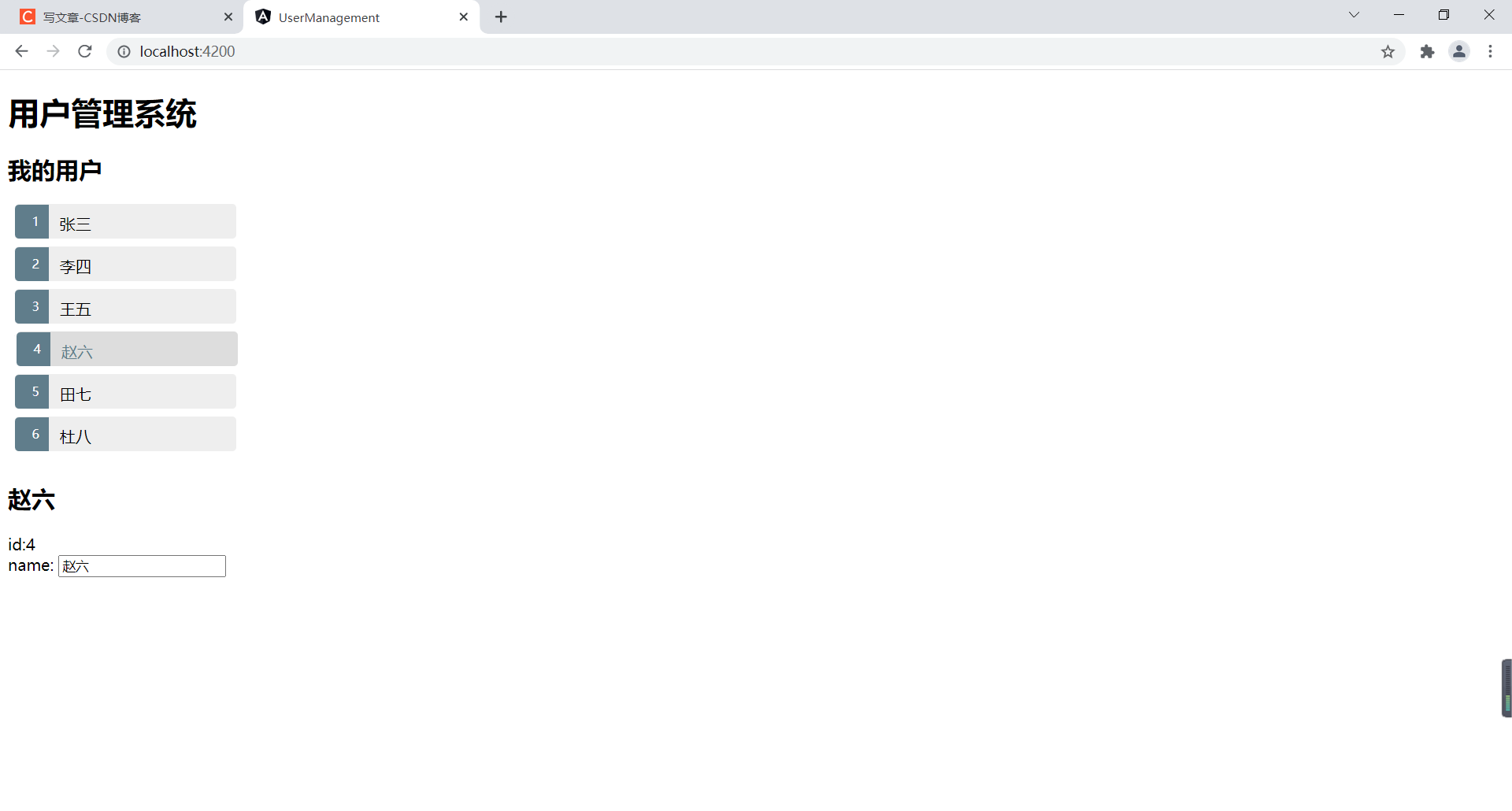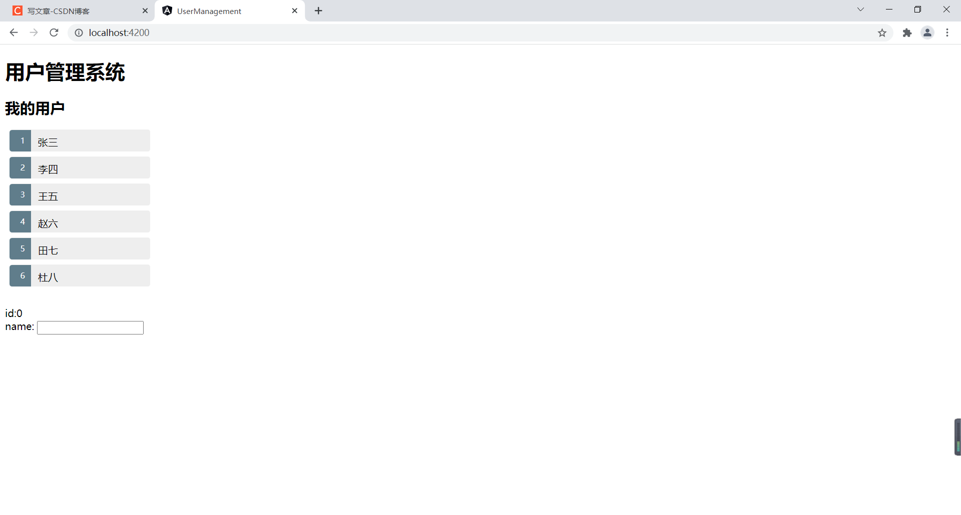 刷新浏览器:  选中某一个用户,可将该用户的编号和名字赋值给下方的id和name。