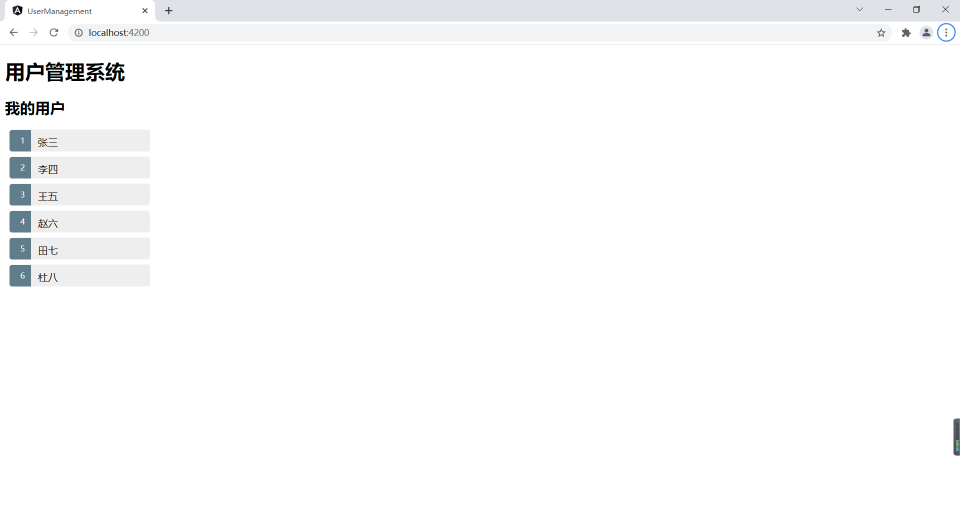 在users.component.html中添加click事件。click外面的圆括号会让Angular监听li标签的click事件。当用户点击li标签时,Angular就会执行表达式onSelect(user)。