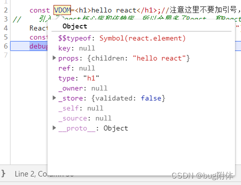 3.const VDOM=<h1>hello react</h1>;//注意这里不要加引号,因为是jsx,不是js