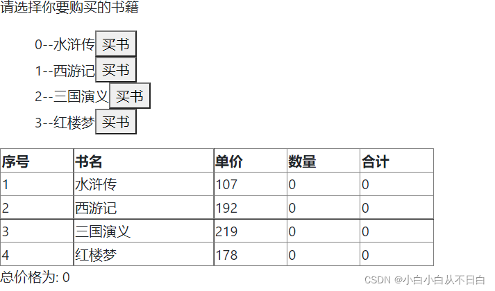 - 当书的数量发现变化时,其对应的“合计”以及“总价格”都应发生相应的改变