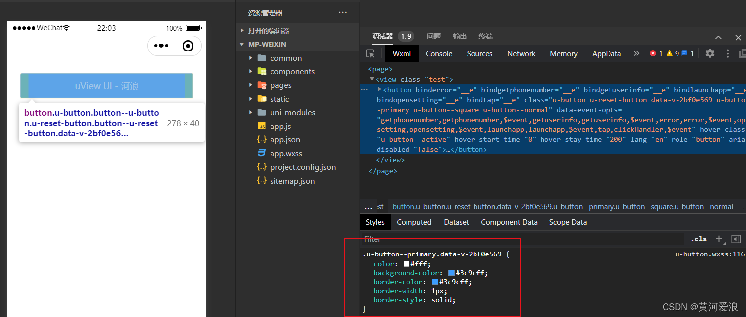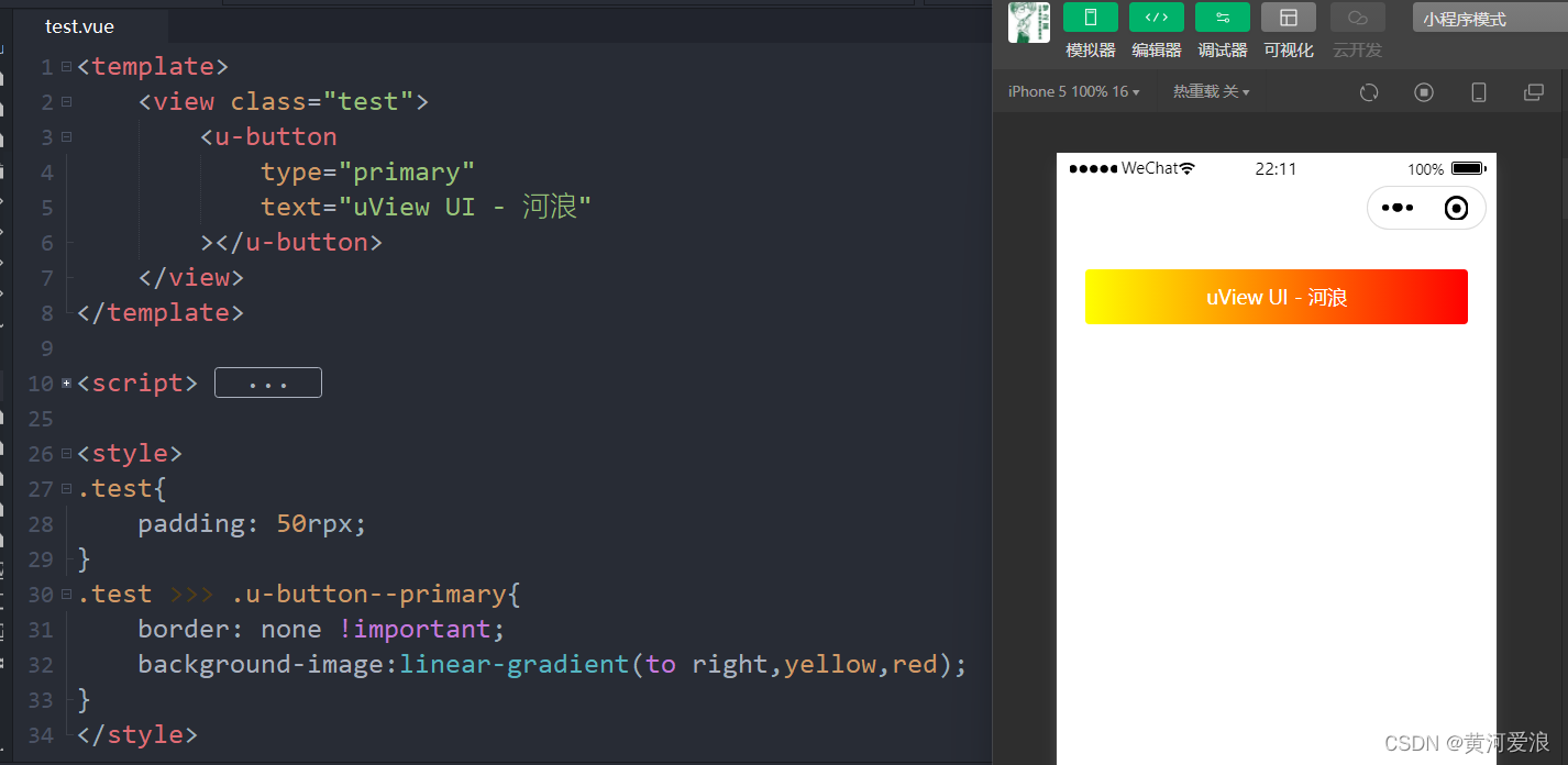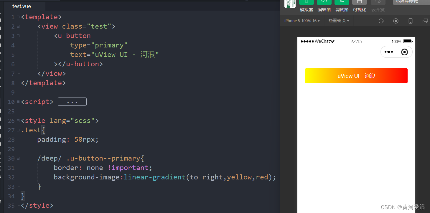 Vue CSS深度作用选择器常用的使用场景就是覆盖自定义组件的样式(有可能组件提供的属性并不满足你的需求),下面以 uView UI?在?微信小程序?平台为例,通过 CSS深度选择器写出一个背景渐变的按钮。