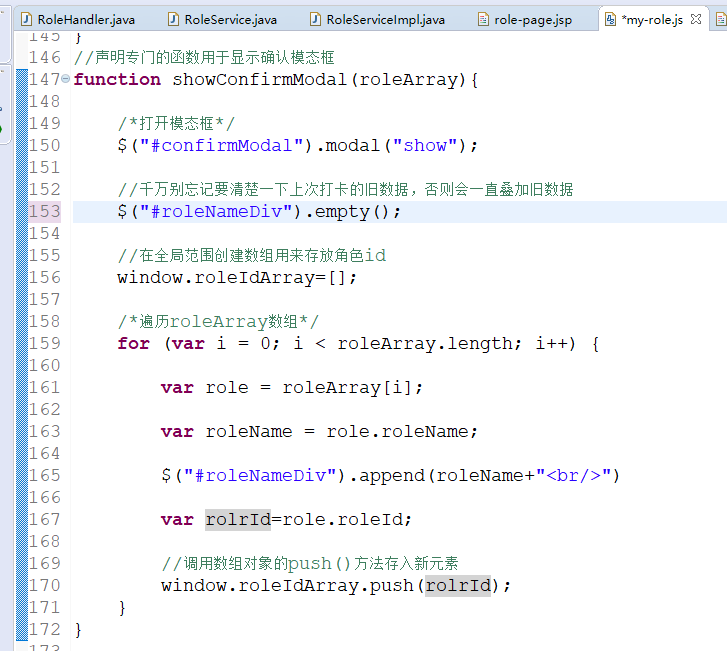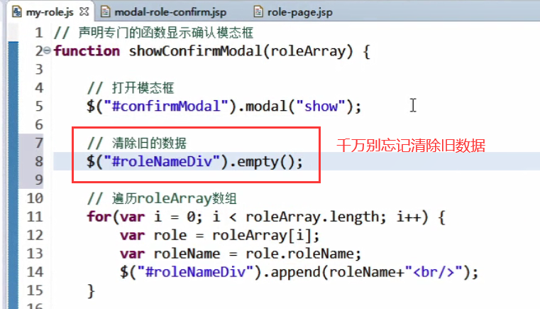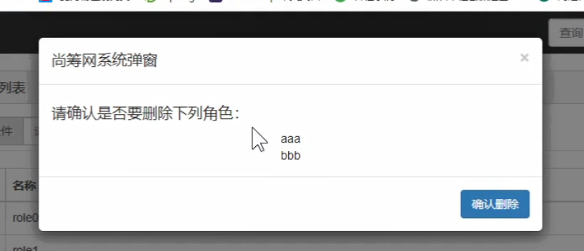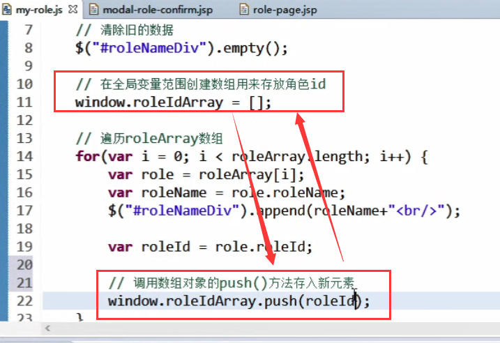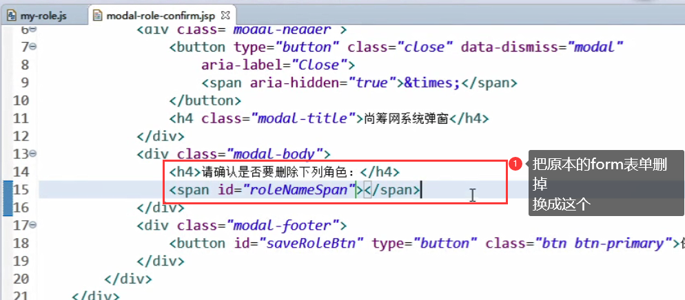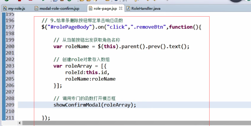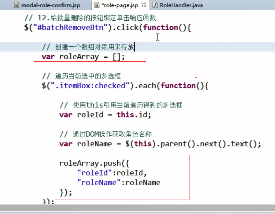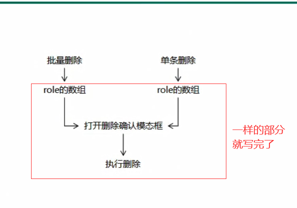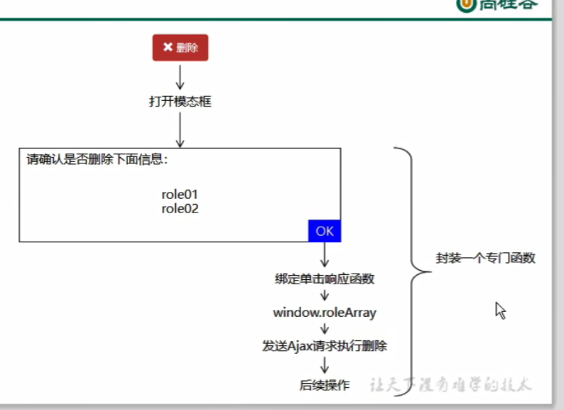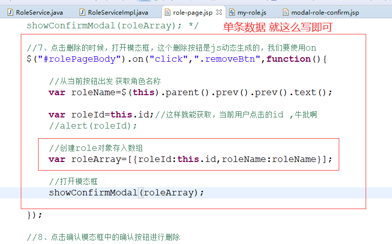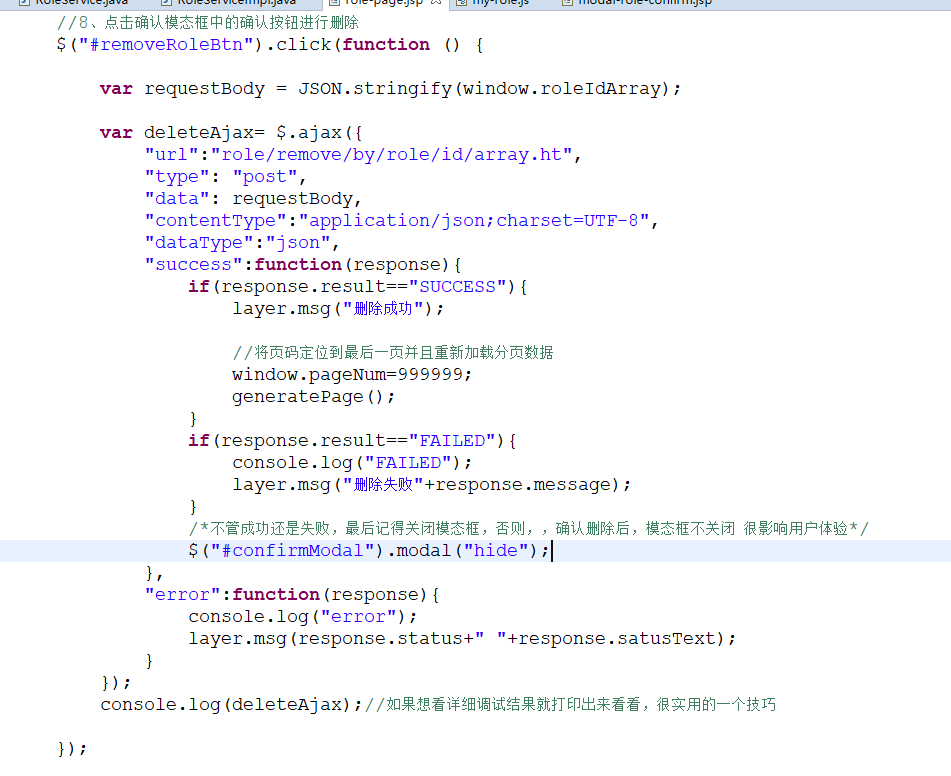 所以我们可以这么写,而不需要向前面修改一样去使用 on,动态生成的就要用on,不是动态生成的可以不用on, 逻辑是,点击删除后,会弹出模态框,让我们确认是否真的删除 我们这里真正触发删除的是确认删除按钮,而不是删除, 而确认删除按钮是模态框里面的,不是js动态生成的,所以不用on 我们要把什么发给后台 我们要把id 数组发给后台 但是这个东西怎么去获取    回过头看 my -role.js 里面怎么写  隔着几个函数,所以我们要考虑用全局变量
