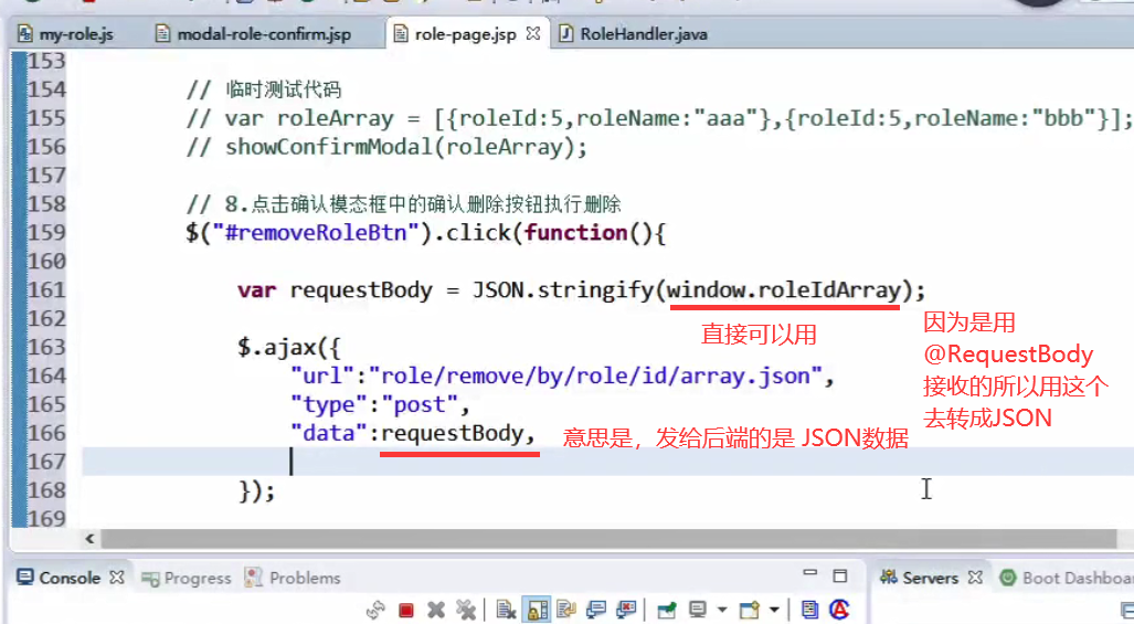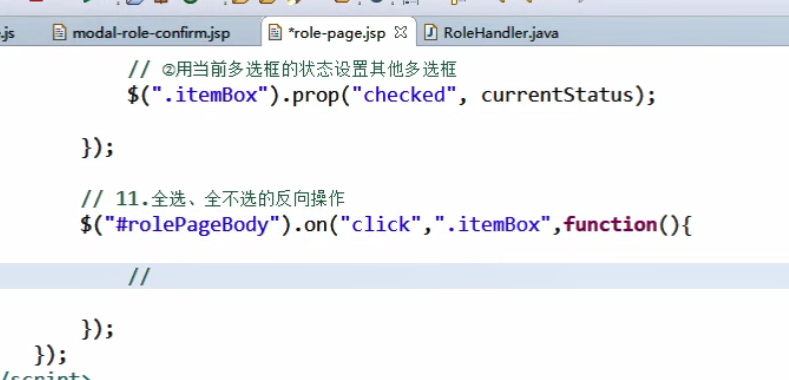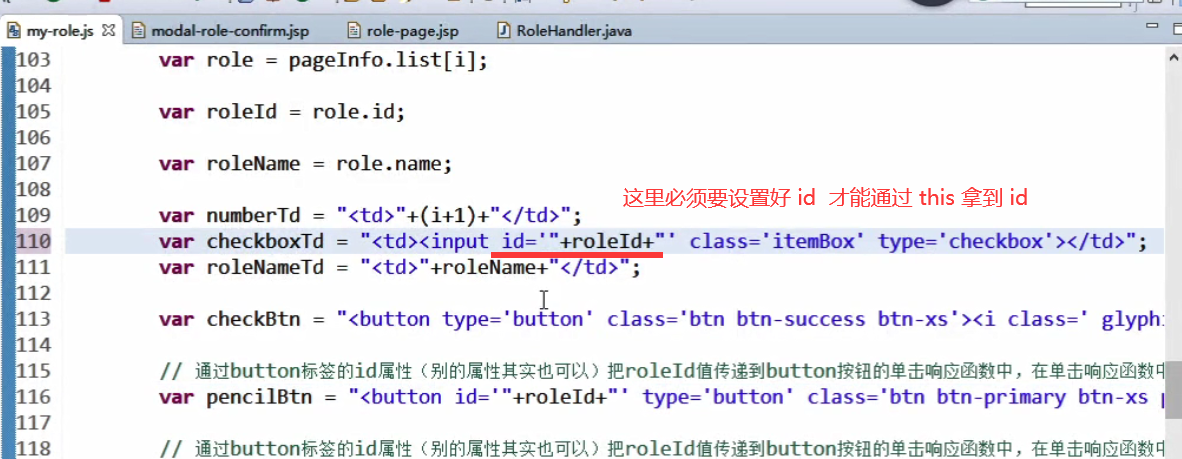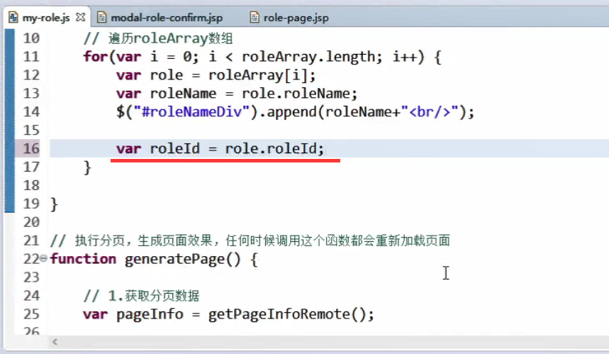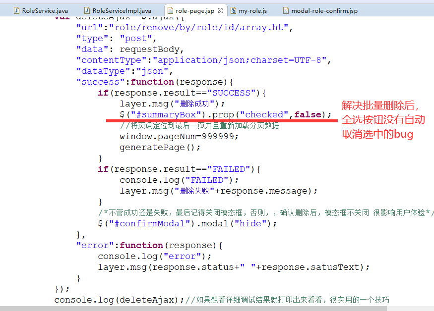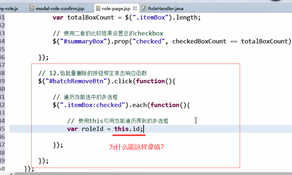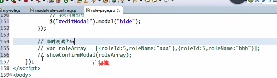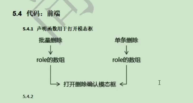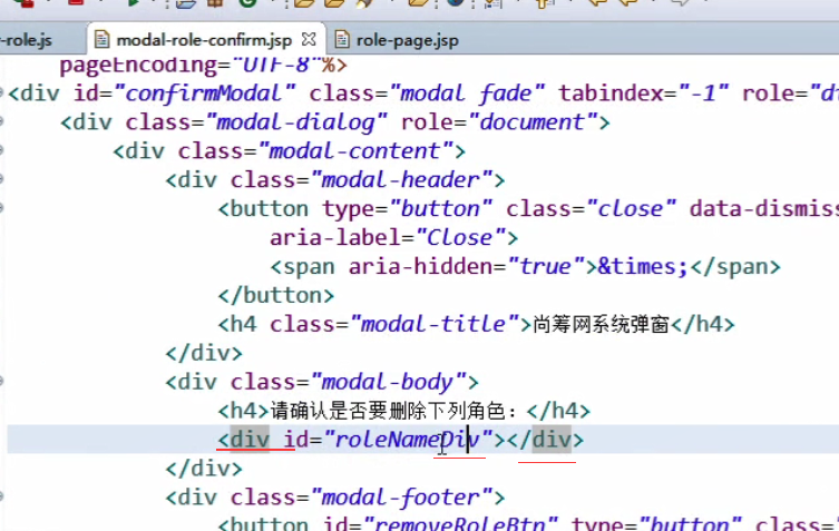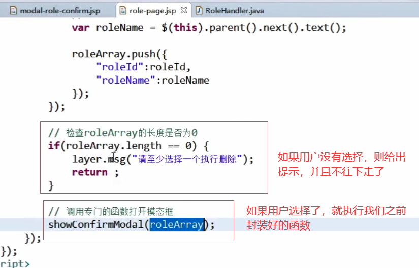 所以我们可以这么写,而不需要向前面修改一样去使用 on,动态生成的就要用on,不是动态生成的可以不用on, 逻辑是,点击删除后,会弹出模态框,让我们确认是否真的删除 我们这里真正触发删除的是确认删除按钮,而不是删除, 而确认删除按钮是模态框里面的,不是js动态生成的,所以不用on 我们要把什么发给后台 我们要把id 数组发给后台 但是这个东西怎么去获取    回过头看 my -role.js 里面怎么写  隔着几个函数,所以我们要考虑用全局变量