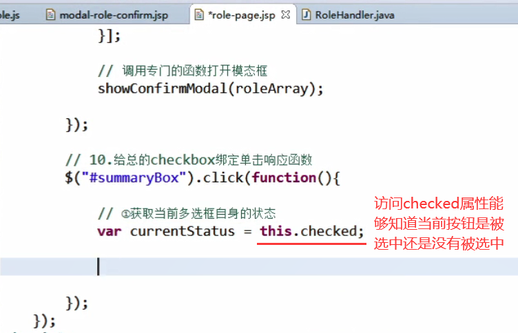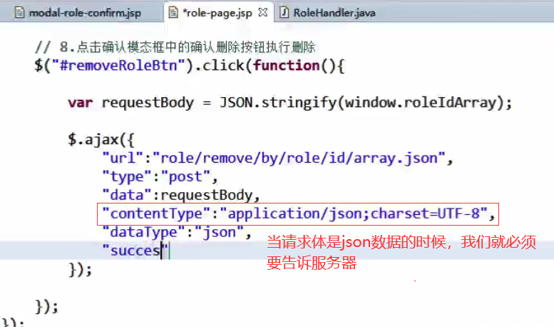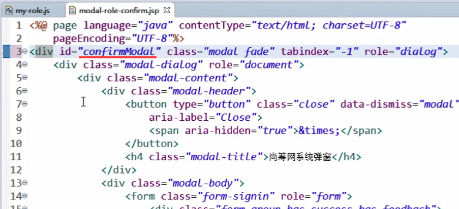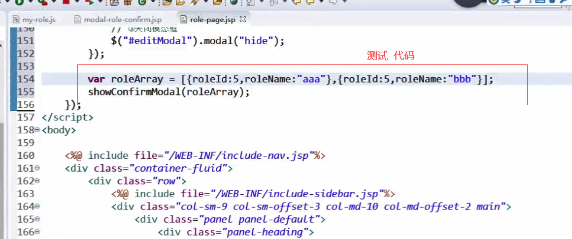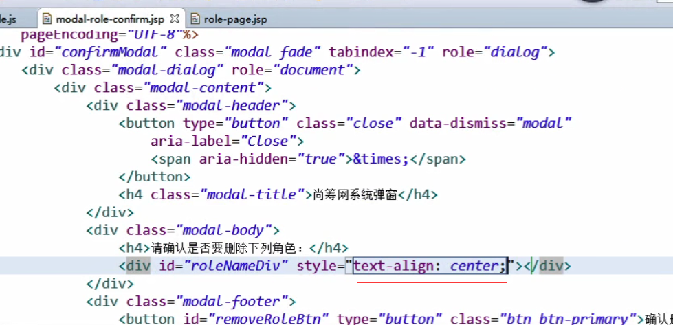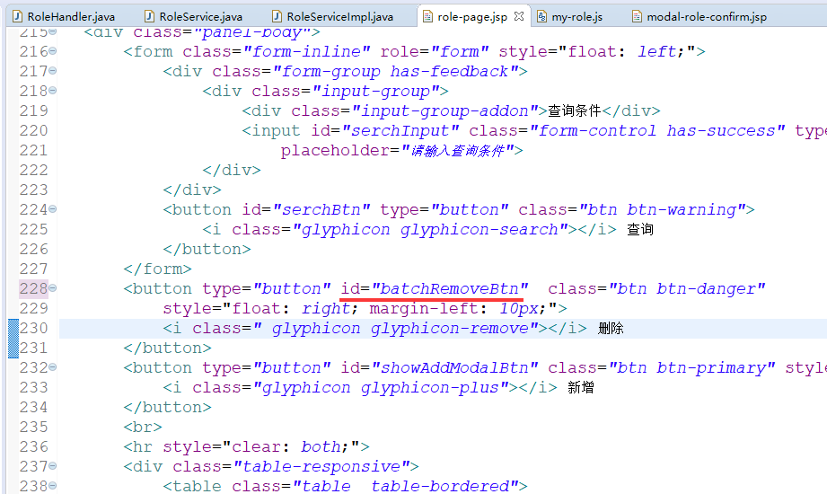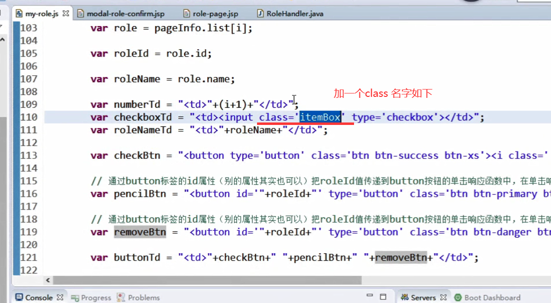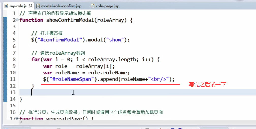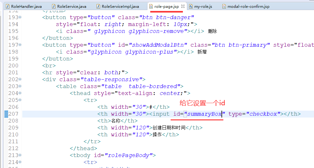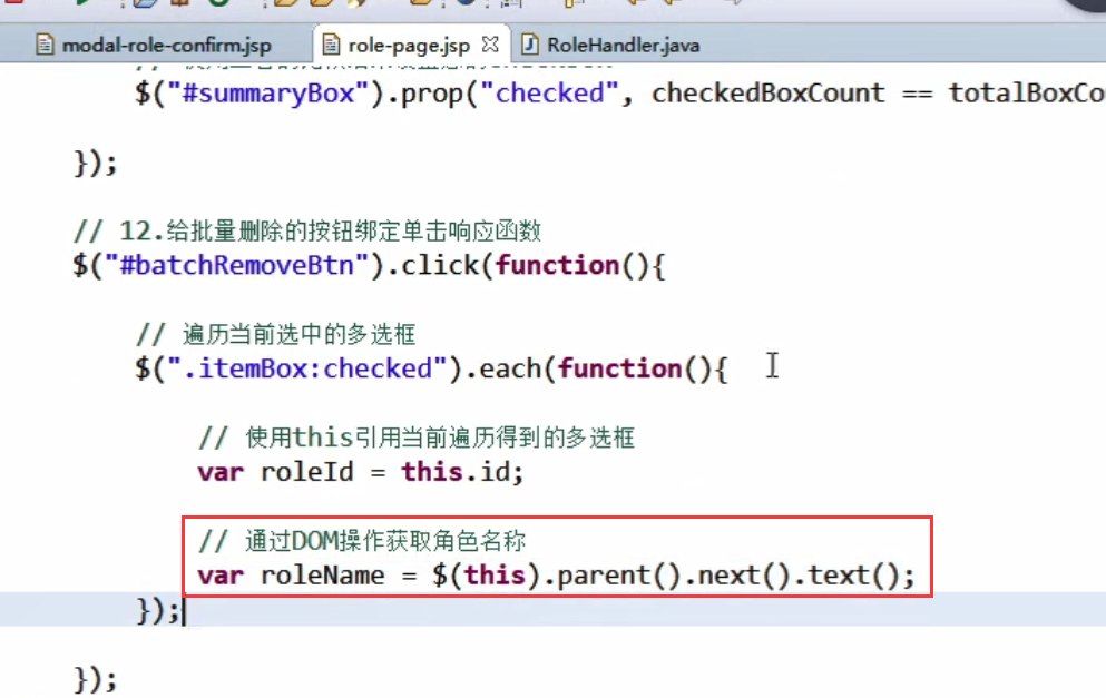 所以我们可以这么写,而不需要向前面修改一样去使用 on,动态生成的就要用on,不是动态生成的可以不用on, 逻辑是,点击删除后,会弹出模态框,让我们确认是否真的删除 我们这里真正触发删除的是确认删除按钮,而不是删除, 而确认删除按钮是模态框里面的,不是js动态生成的,所以不用on 我们要把什么发给后台 我们要把id 数组发给后台 但是这个东西怎么去获取    回过头看 my -role.js 里面怎么写  隔着几个函数,所以我们要考虑用全局变量