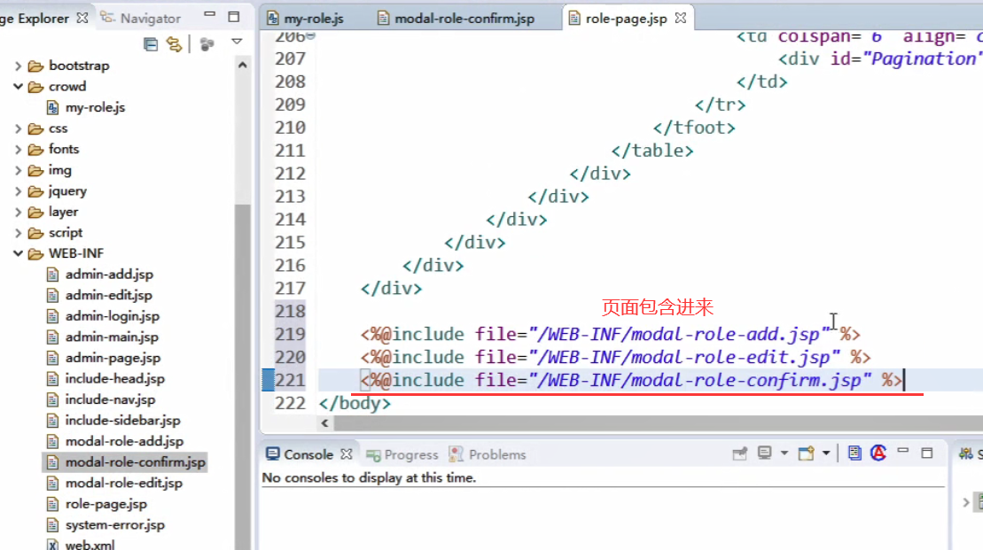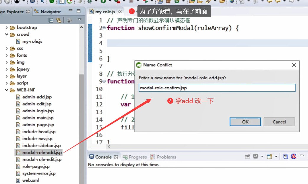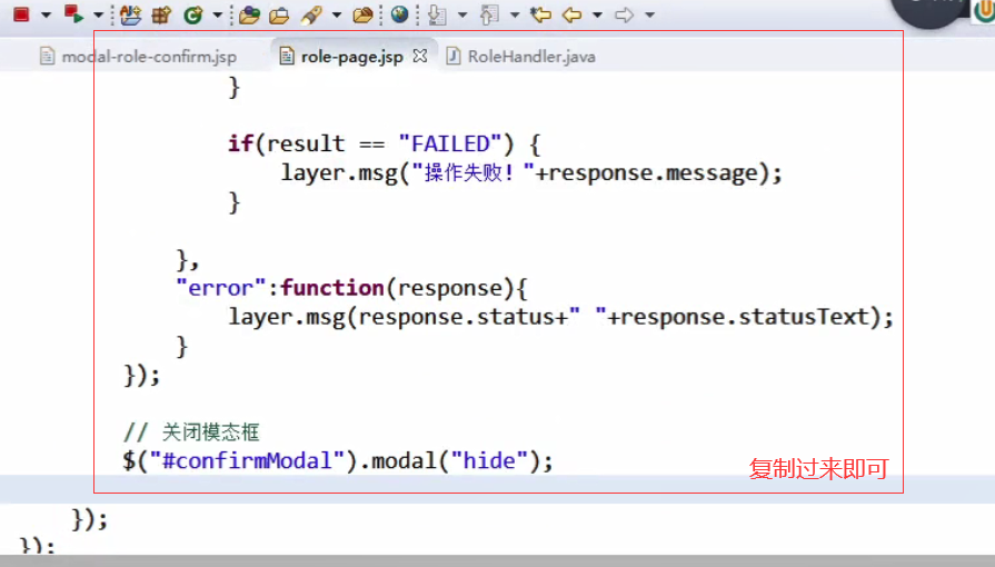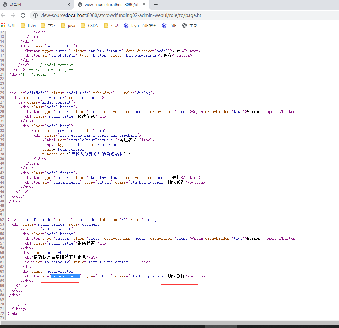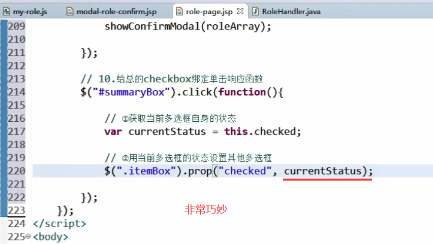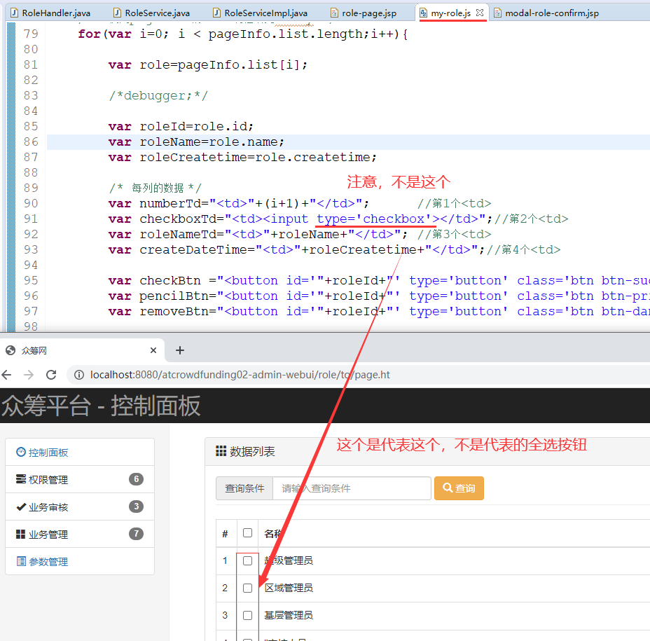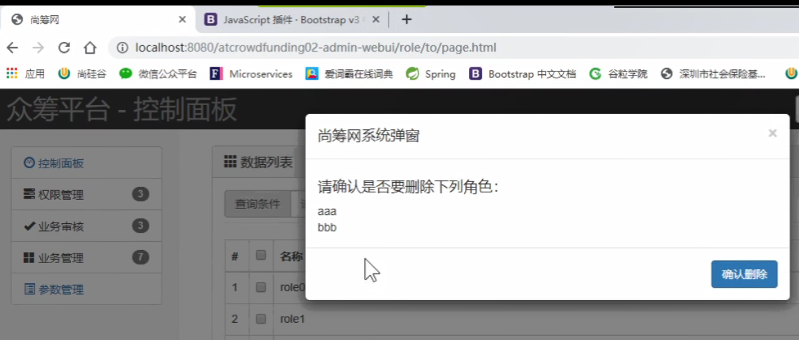 所以我们可以这么写,而不需要向前面修改一样去使用 on,动态生成的就要用on,不是动态生成的可以不用on, 逻辑是,点击删除后,会弹出模态框,让我们确认是否真的删除 我们这里真正触发删除的是确认删除按钮,而不是删除, 而确认删除按钮是模态框里面的,不是js动态生成的,所以不用on 我们要把什么发给后台 我们要把id 数组发给后台 但是这个东西怎么去获取    回过头看 my -role.js 里面怎么写  隔着几个函数,所以我们要考虑用全局变量
