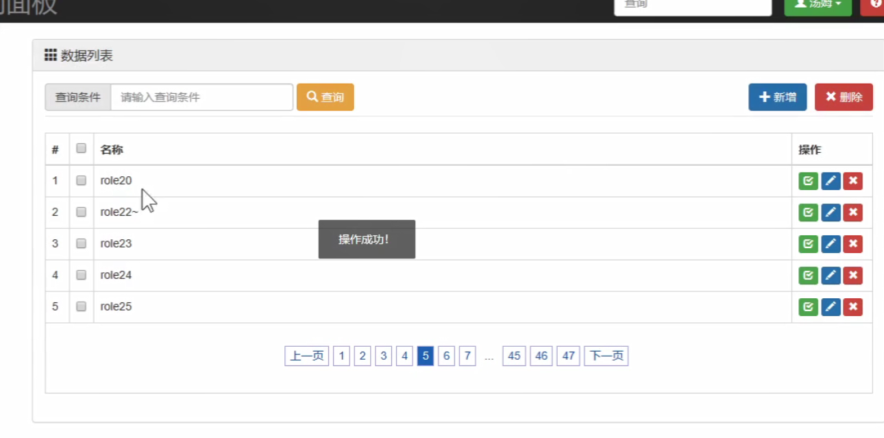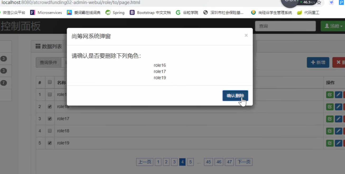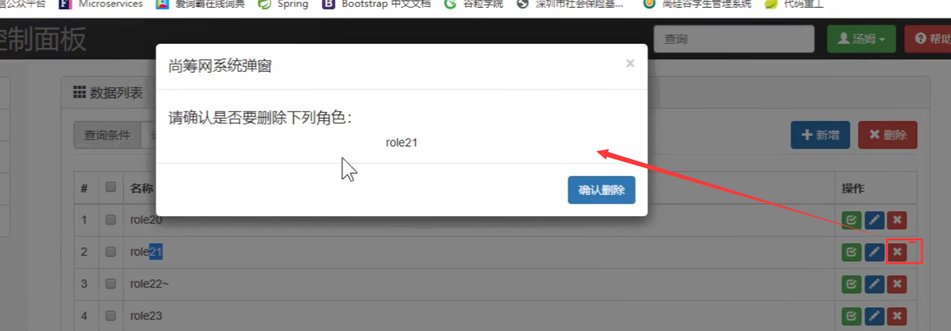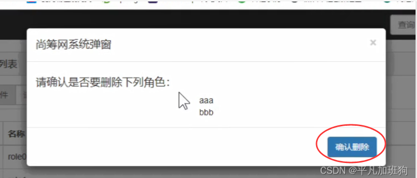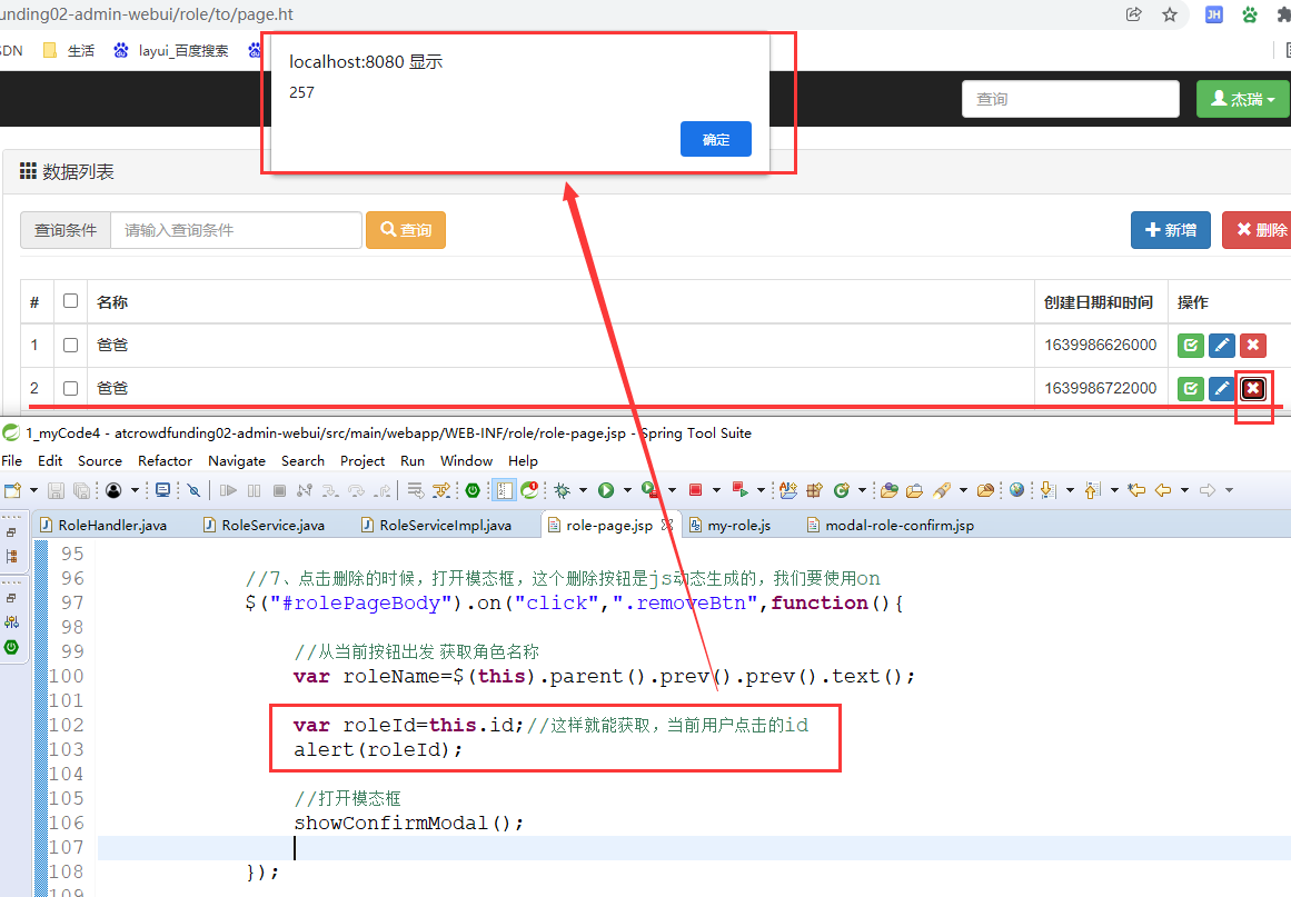 同理,删除跟修改一样 动态生成的数据需要使用特定方式绑定函数on函数的使用,解决只有当前页面可以弹出模态框,其它页面弹不出来的问题_dom操作获取角色名称显示回显