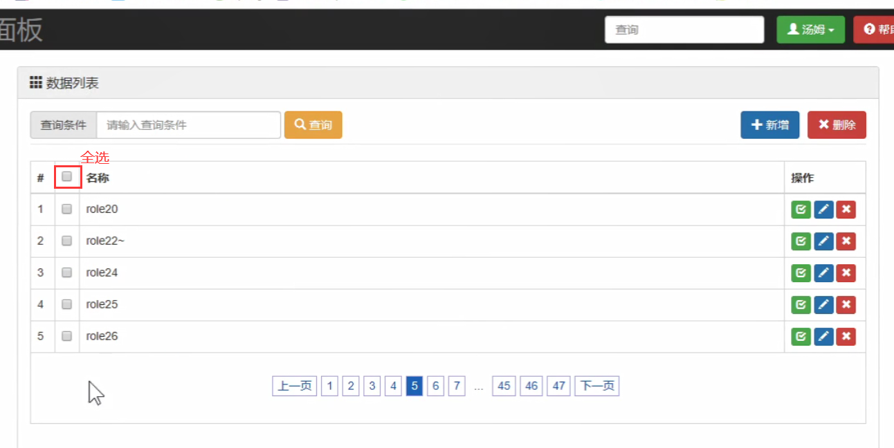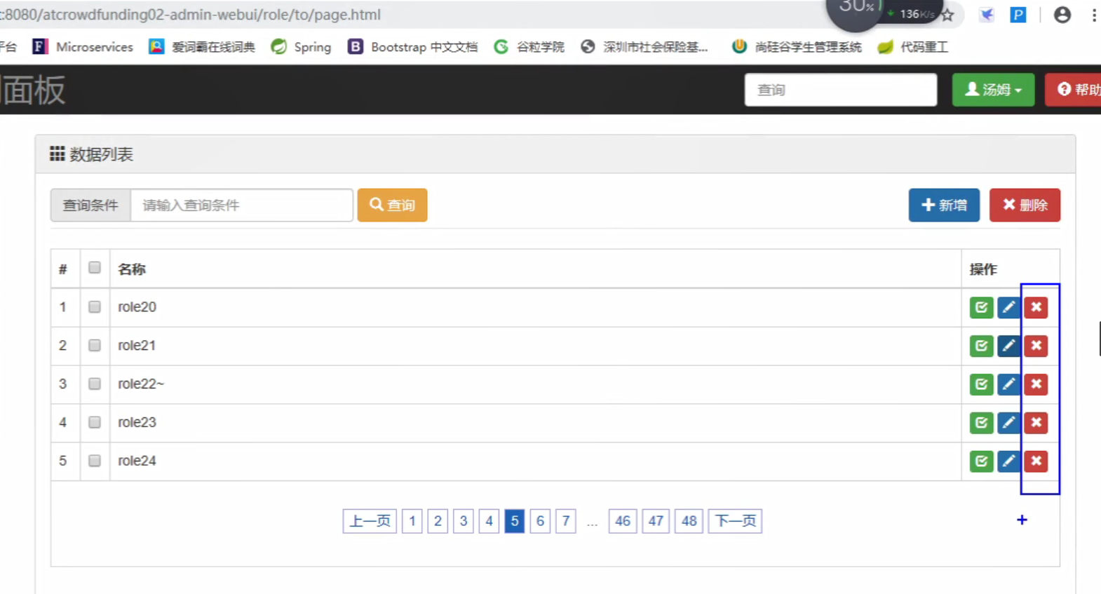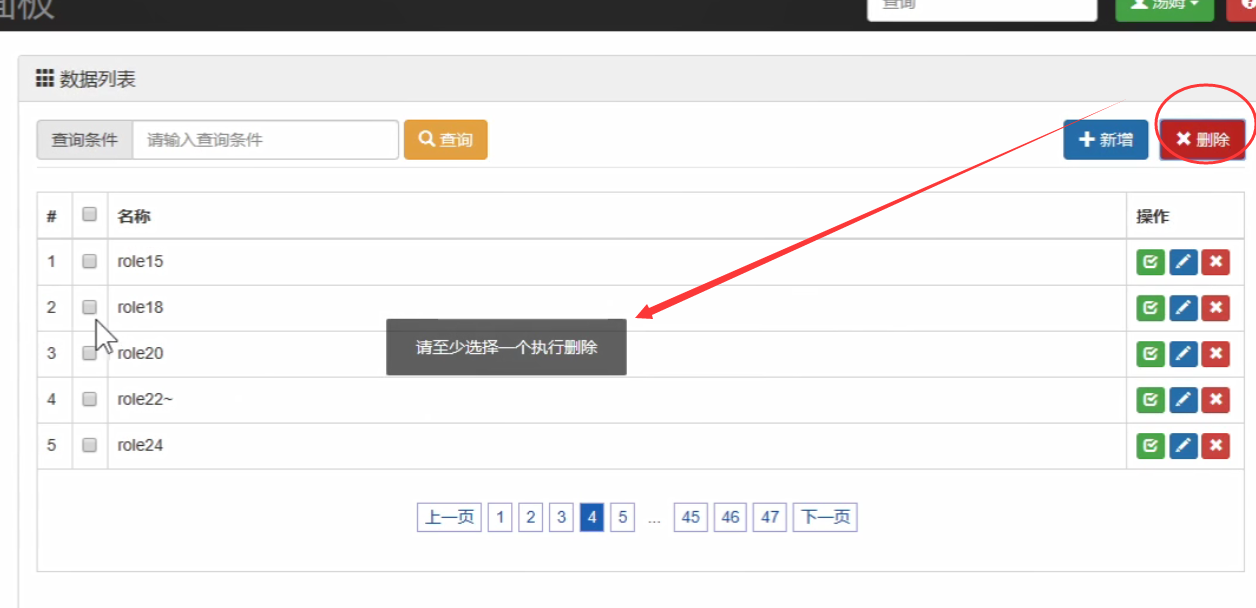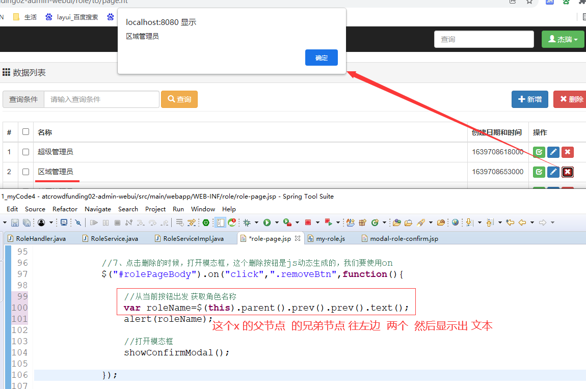 同理,删除跟修改一样 动态生成的数据需要使用特定方式绑定函数on函数的使用,解决只有当前页面可以弹出模态框,其它页面弹不出来的问题_dom操作获取角色名称显示回显