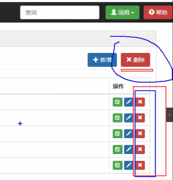 前面已经讲过,这里为了结合批量删除的理解 我们再说一遍 首先注意,这里每一行数据的删除按钮 是js动态生成的,所以绑定这个按钮的事件 要用on     整理一下代码  下面就是看批量删除