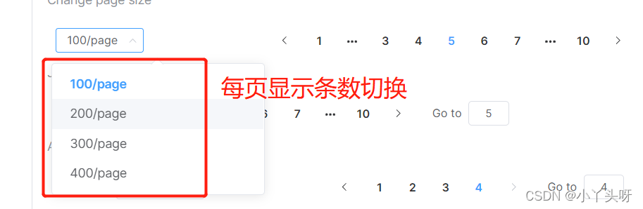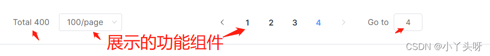 - ?page-sizes 属性,它是一个数组。作用是定义每页显示条数的切换。该数组中提供了几项数据,下拉框中应会显示几项数据