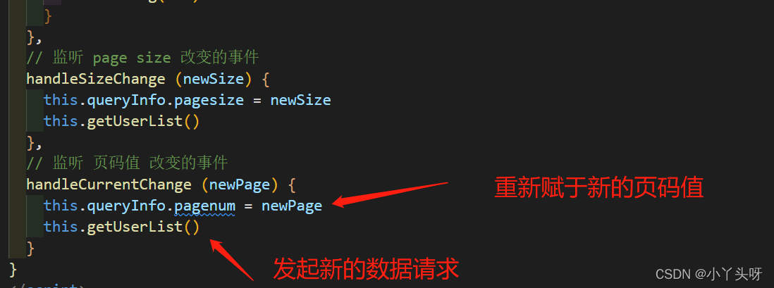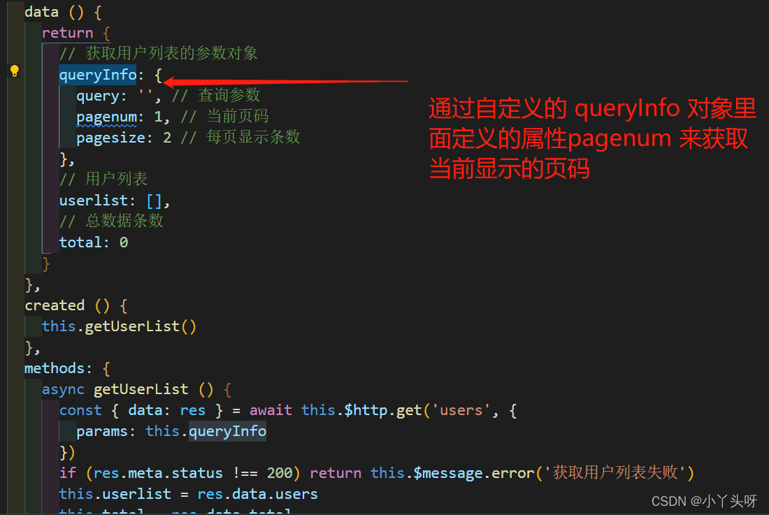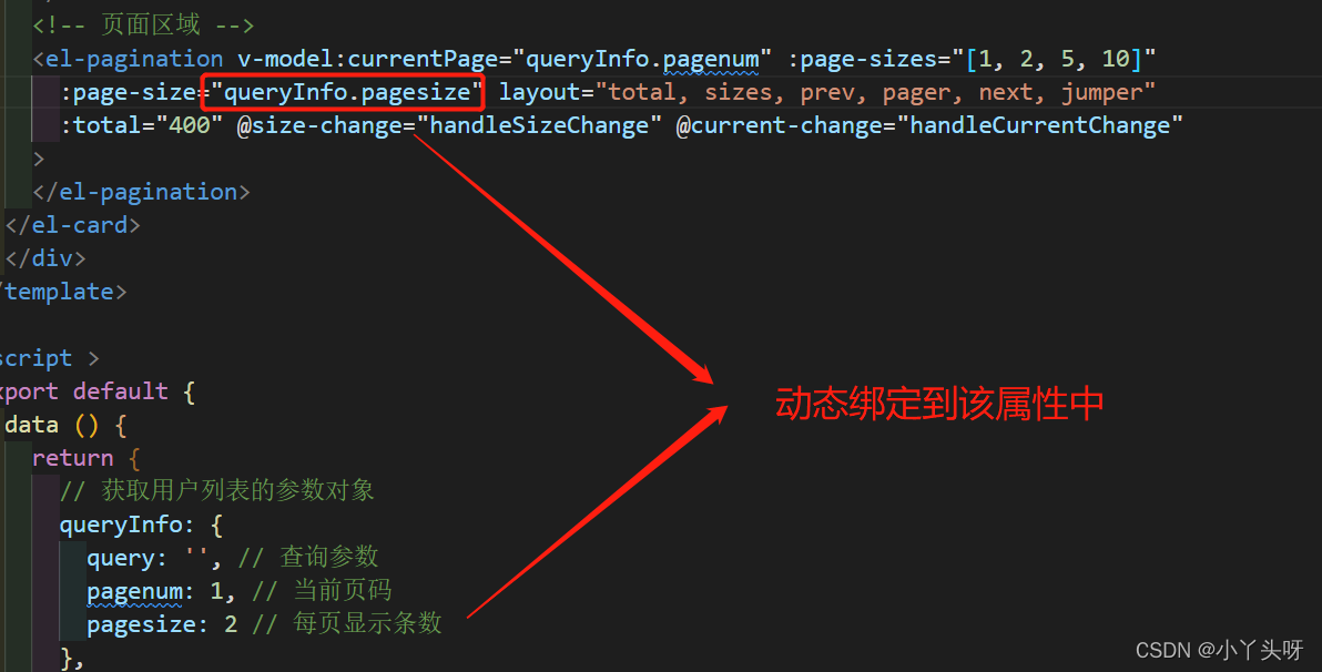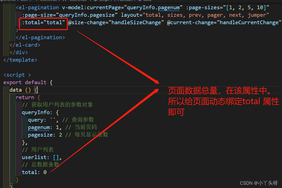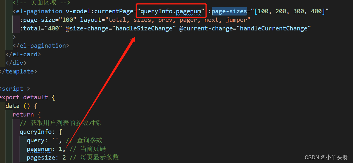 ?当前显示的第几页数据,通过 queryInfo 对象里面的定义的pagenum 属性来显示,所以需要把自定义的pagenum 属性绑定到?currentPage?属性中