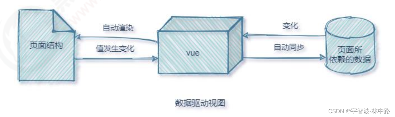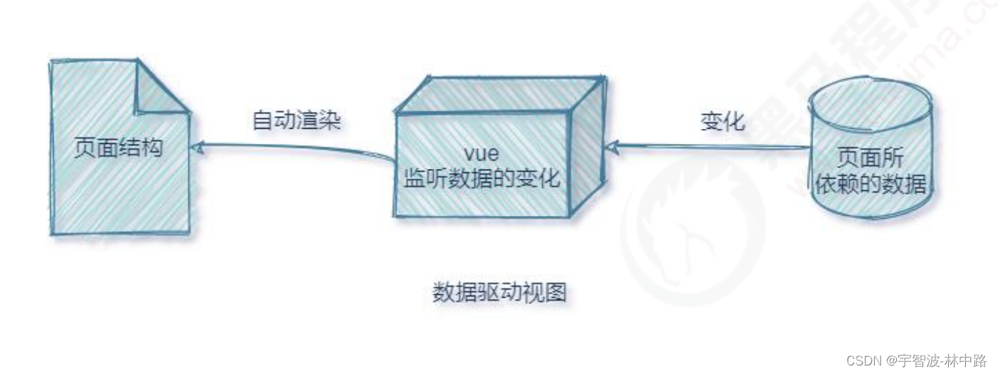 在使用了 vue 的页面中,vue 会监听数据的变化,从而自动重新渲染页面的结构。示意图如下: