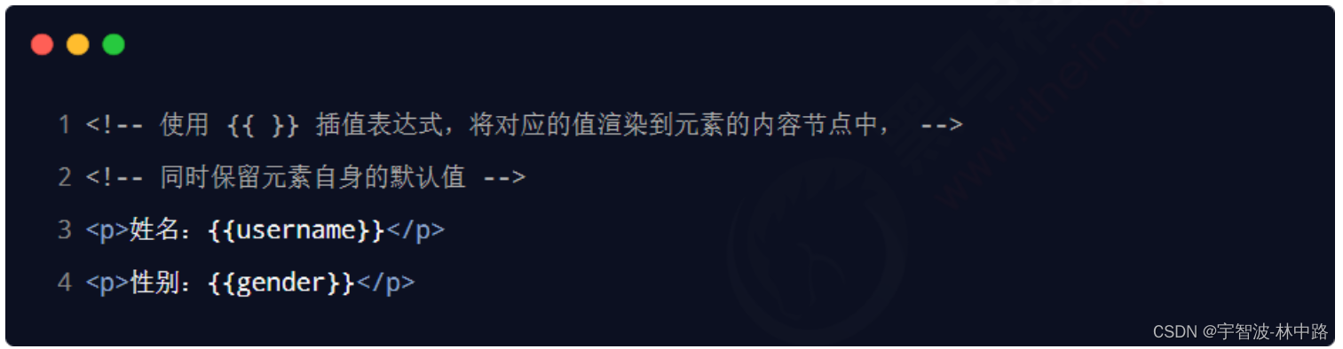 vue 提供的 {{ }} 语法,专门用来解决 v-text 会覆盖默认文本内容的问题。这种 {{ }} 语法的专业名称是插值表达式(英文名为:Mustache)。
