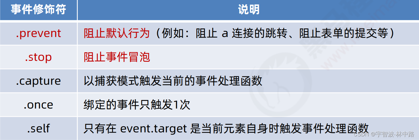 在事件处理函数中调用 event.preventDefault() 或 event.stopPropagation() 是非常常见的需求。因此, vue 提供了事件修饰符的概念,来辅助程序员更方便的对事件的触发进行控制。常用的 5 个事件修饰符如下: