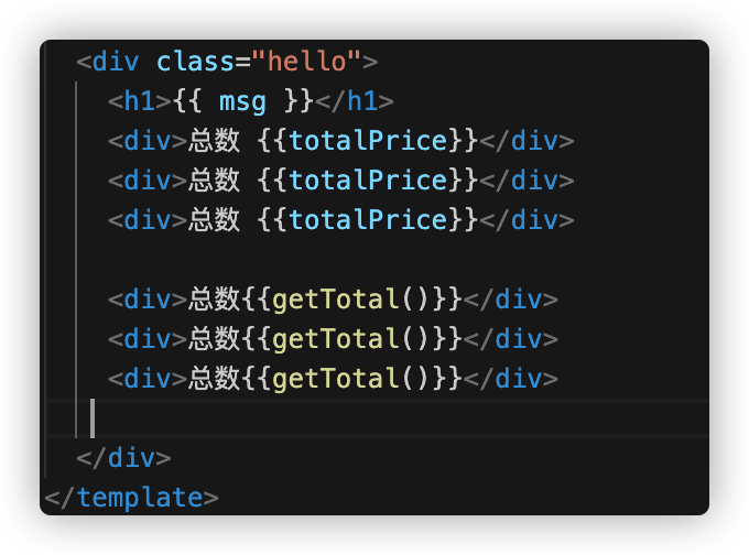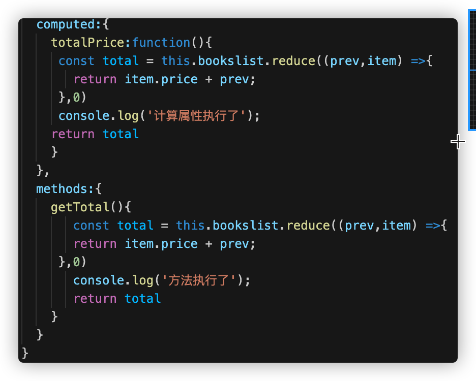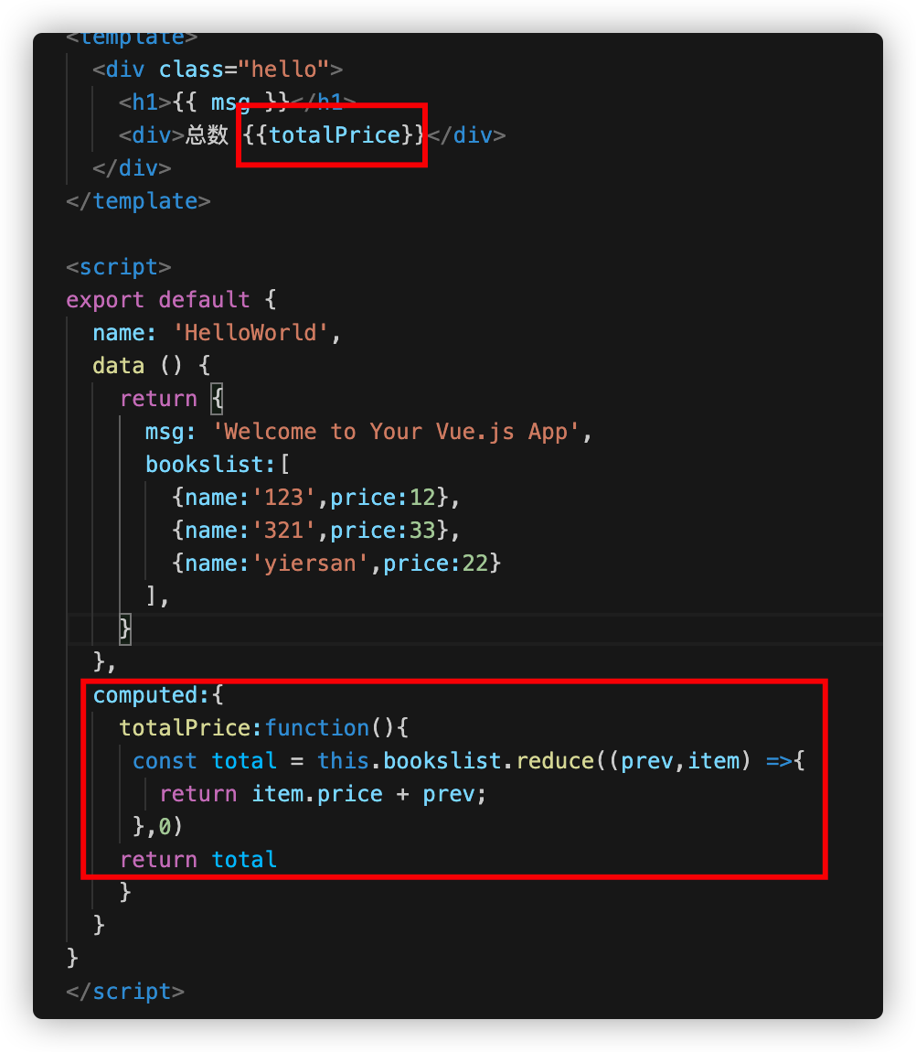 当我们有一个数组对象,想要在页面中直接展示数组对象某一个值的总和时,我们可以使用method或者使用计算属性。后续为什么使用计算属性,而不用method后文会提及到的。  页面展示书的总价这里就使用了计算属性,在计算属性中定义一个值,可以在页面中直接使用。
