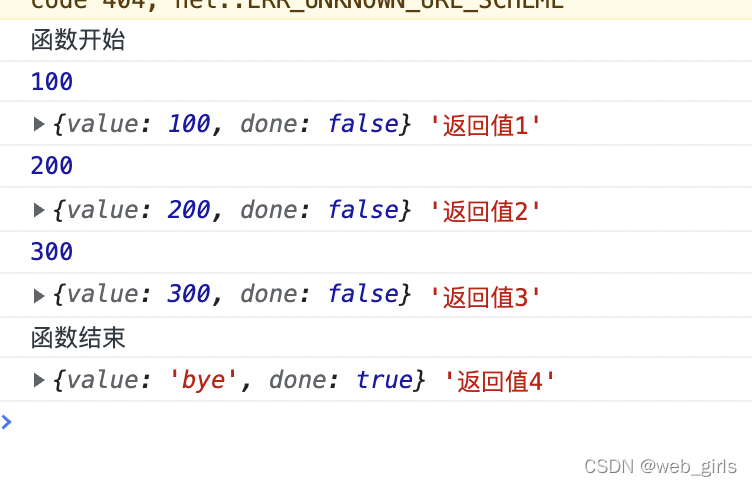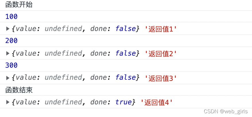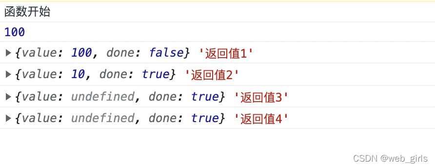 next方法有如下要求:是一个无参函数,返回一个拥有以下两个属性的对象(genrantor是特殊的迭代器他有参数)