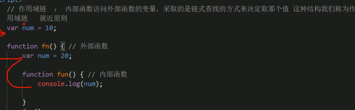 ●只要是代码,就至少有一个作用域 ●写在函数内部的局部作用域 ●如果函数中还有函数,那么在这个作用域中就又可以诞生一个作用域 ●根据在内部函数可以访问外部函数变量的这种机制,用链式查找决定哪些数据能被内部函数访问,就称作??作用域链 ?